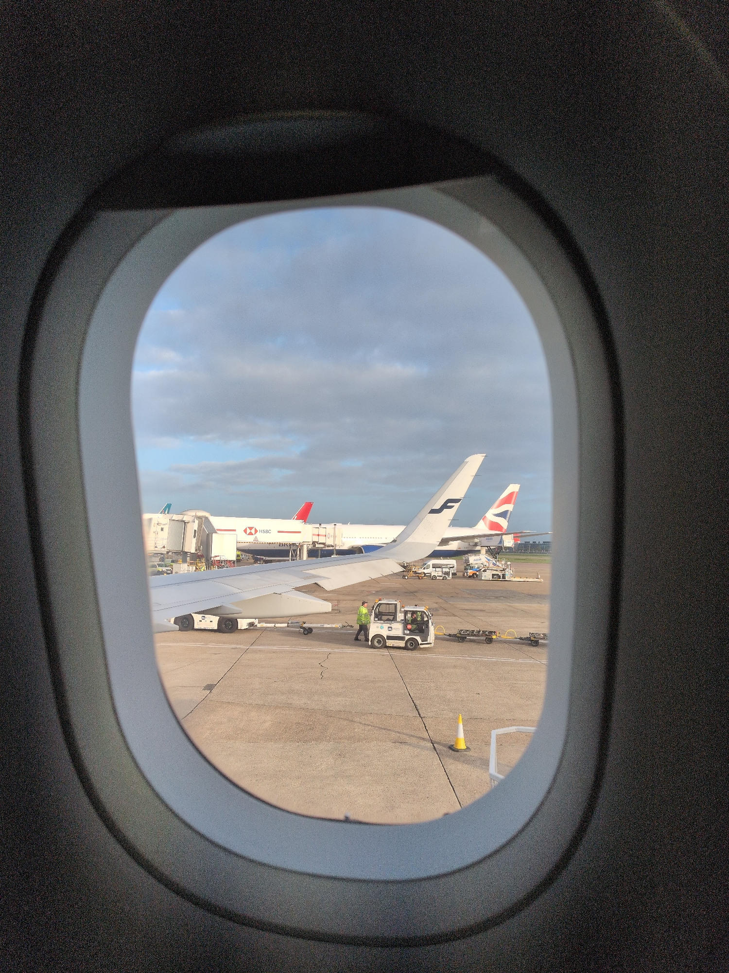 View through an airplane window. The wing of the airplane is visible in the foreground. In the background, other airplanes are at their gates. One is a British Airways plane with a Union Jack on the t…read more