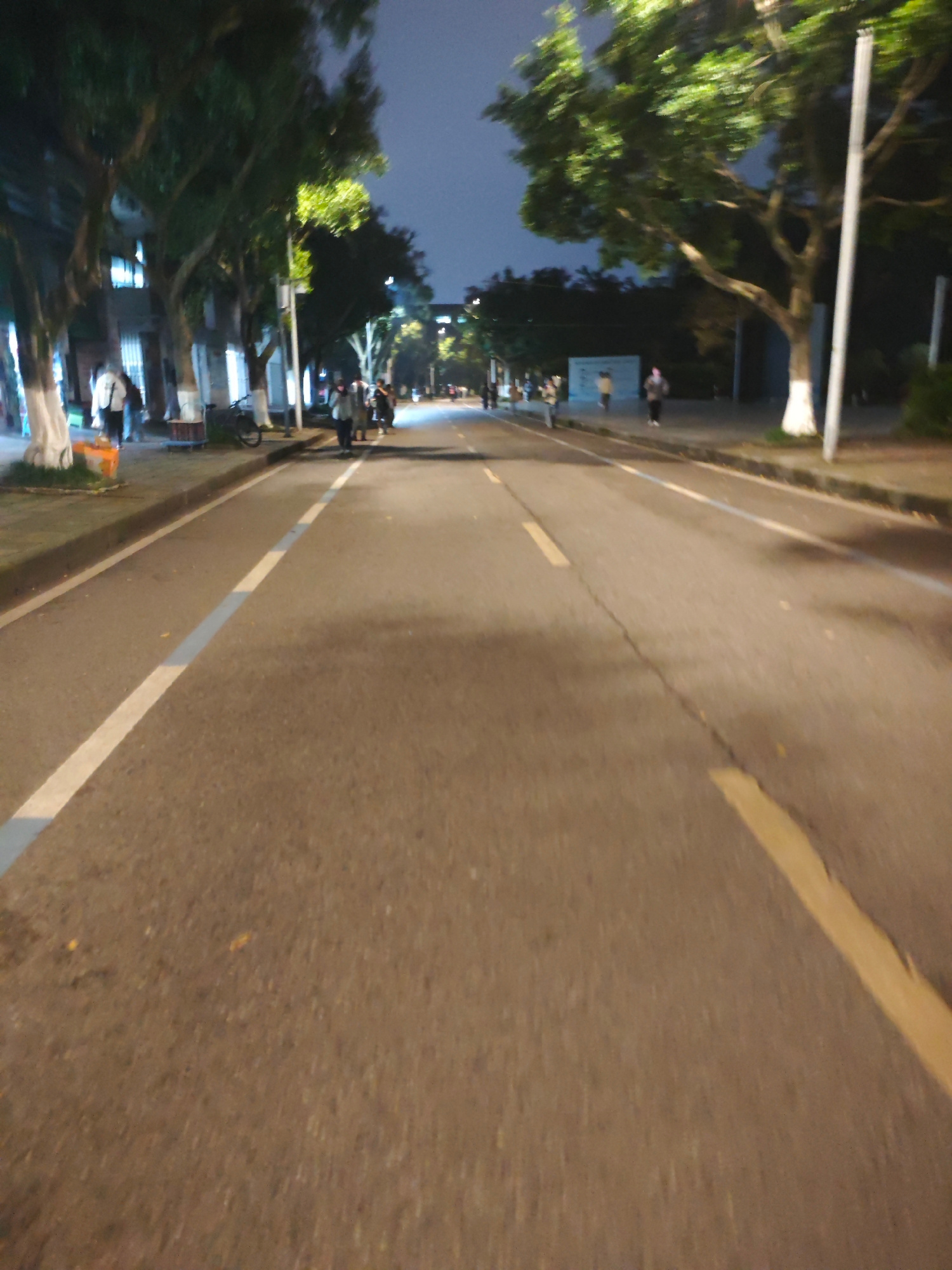 The image shows a road at night in Chongqing High-tech Zone, China. The road is paved and has a combination of solid and dashed white and yellow lines marking lanes. There are trees lining both sides…read more