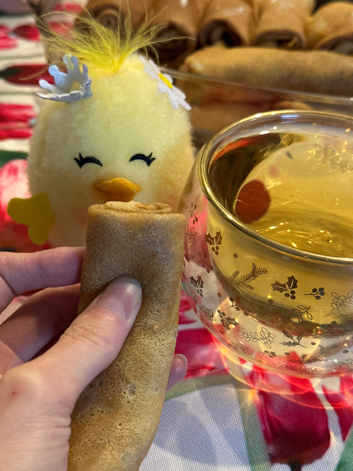 The scene, located in the city of Wisła, Poland, depicts a close-up, illuminated indoor setting. A human hand, with visible skin texture, holds a single, light brown rolled crepe in the center-left fo…read more