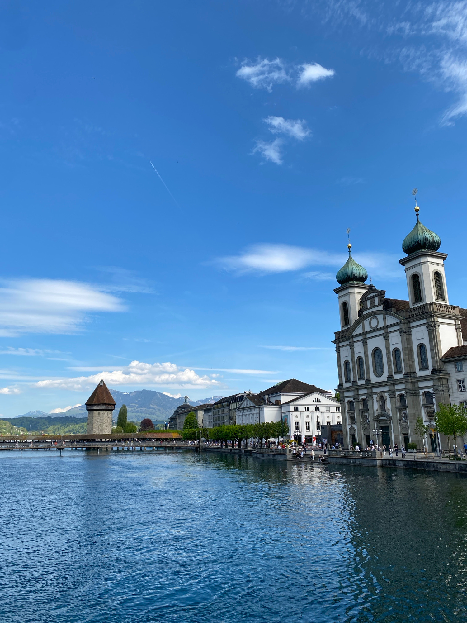 The image presents a picturesque waterfront scene in Lucerne, Switzerland, bathed in bright daylight under a clear blue sky. A wide body of water, likely the Reuss River or Lake Lucerne, occupies the…read more