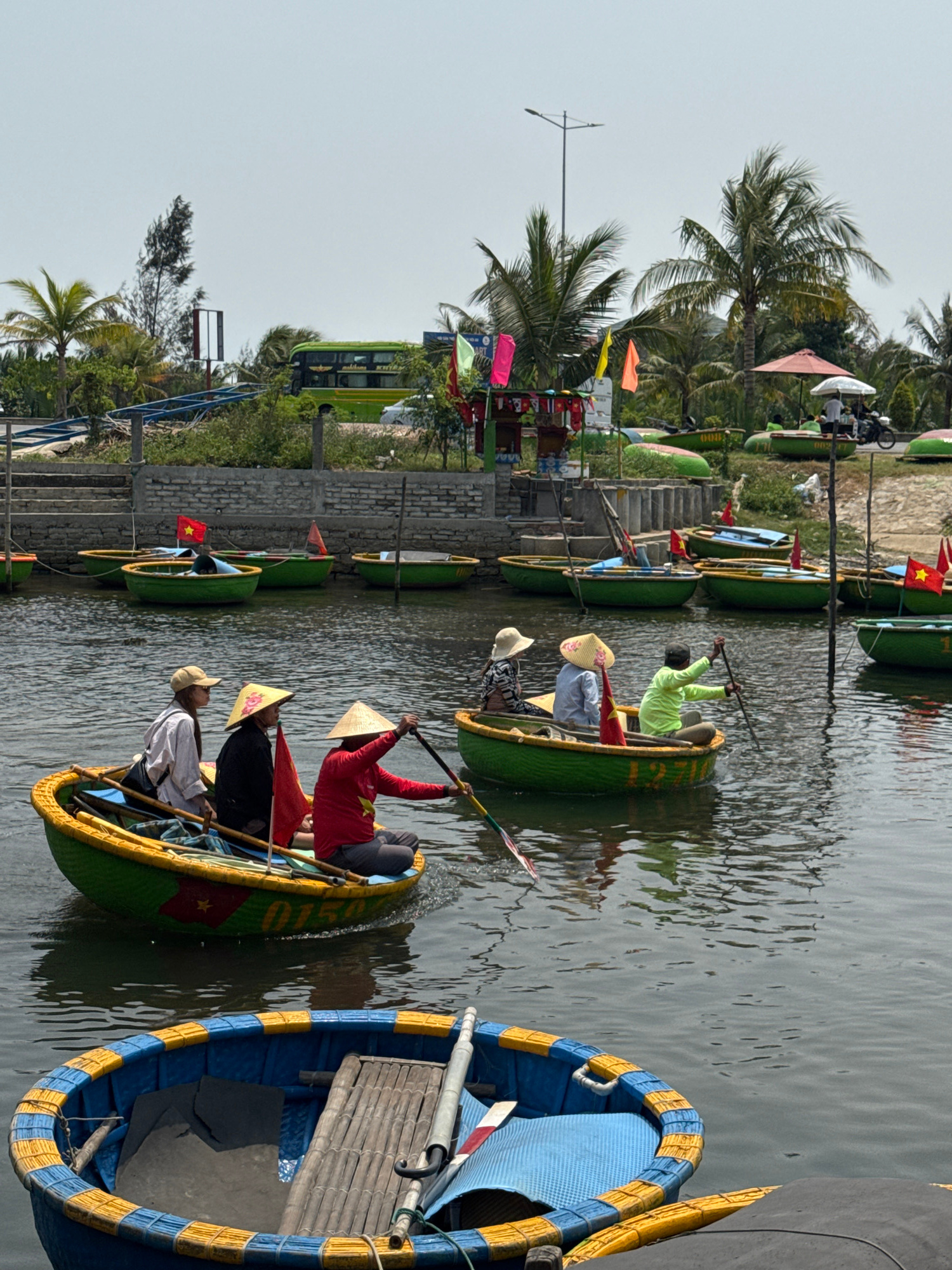 This image captures a vibrant scene of traditional Vietnamese basket boats (thung chai) on a waterway, likely in the Da Nang region of Vietnam. The scene is set during bright daylight under a clear, p…read more