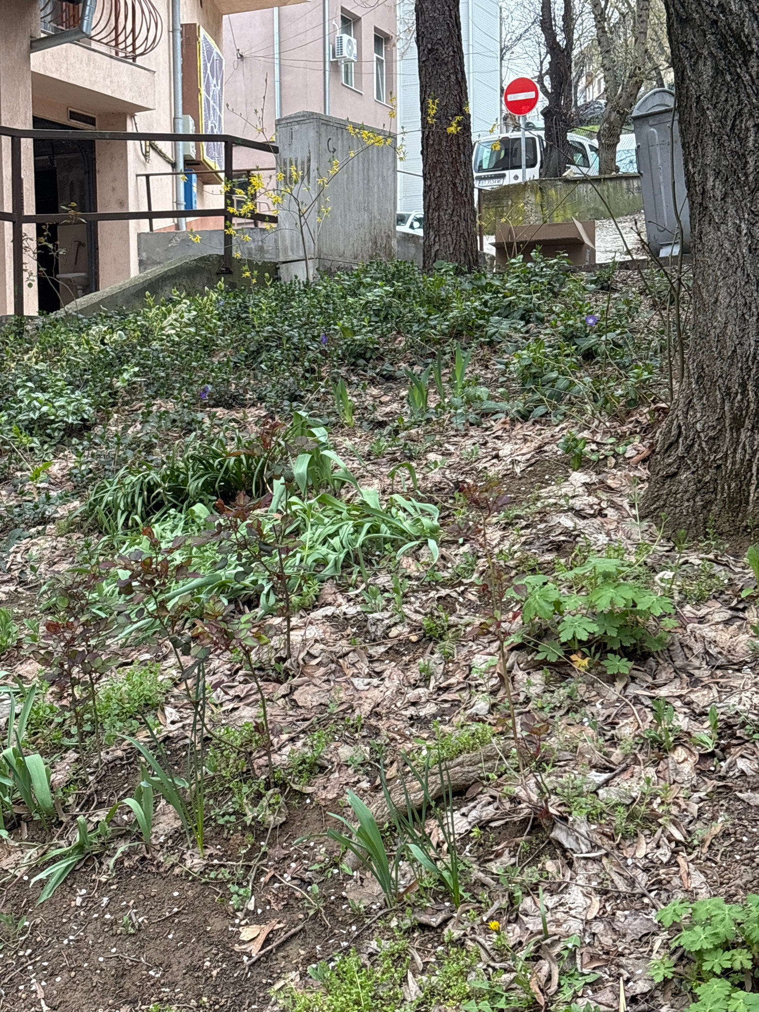 The image depicts a scene in Veliko Tarnovo, Bulgaria, characterized by a blend of urban and natural elements. The foreground consists of a patch of ground covered with dead leaves and interspersed wi…read more