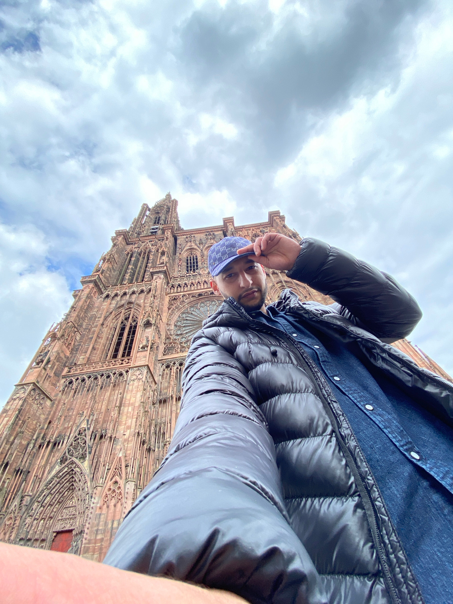 A man wearing a blue paisley bandana and a black puffer jacket with a denim shirt underneath stands in front of the Strasbourg Cathedral in Strasbourg, France. The cathedral is tall, ornate, and constβ¦read more