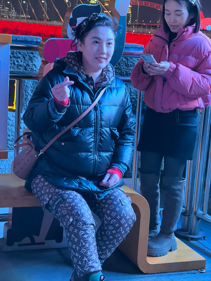 An outdoor nighttime scene in Yuzhong District, China, depicts two East Asian females illuminated by artificial blue light, with distant red urban lighting. A woman, appearing middle-aged, is seated o…read more