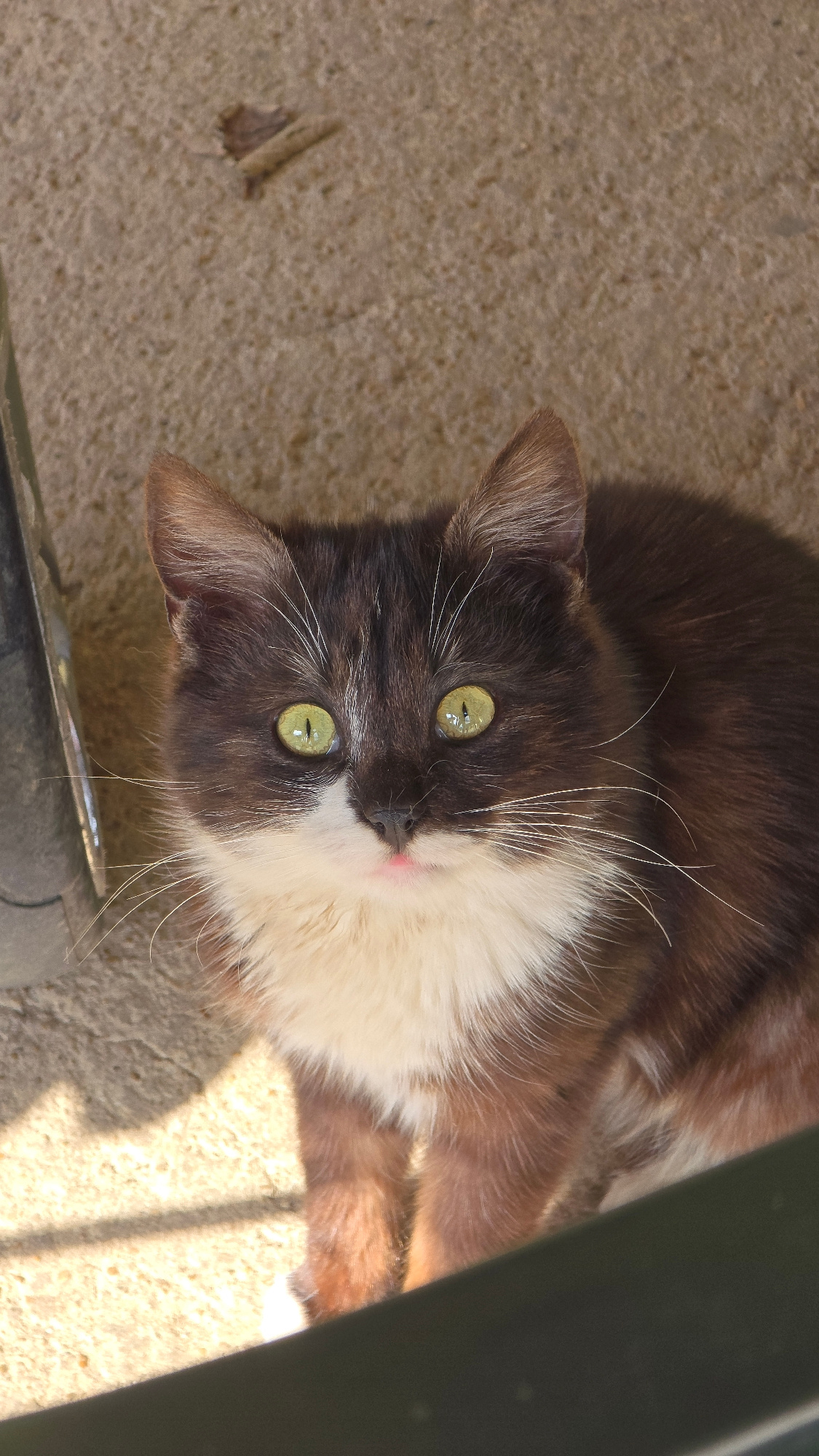 A close-up, eye-level shot depicts a cat with dark brown and white fur lying on a concrete surface. The cat's head is centered, and its yellow-green eyes are staring directly at the camera. Its nose i…read more