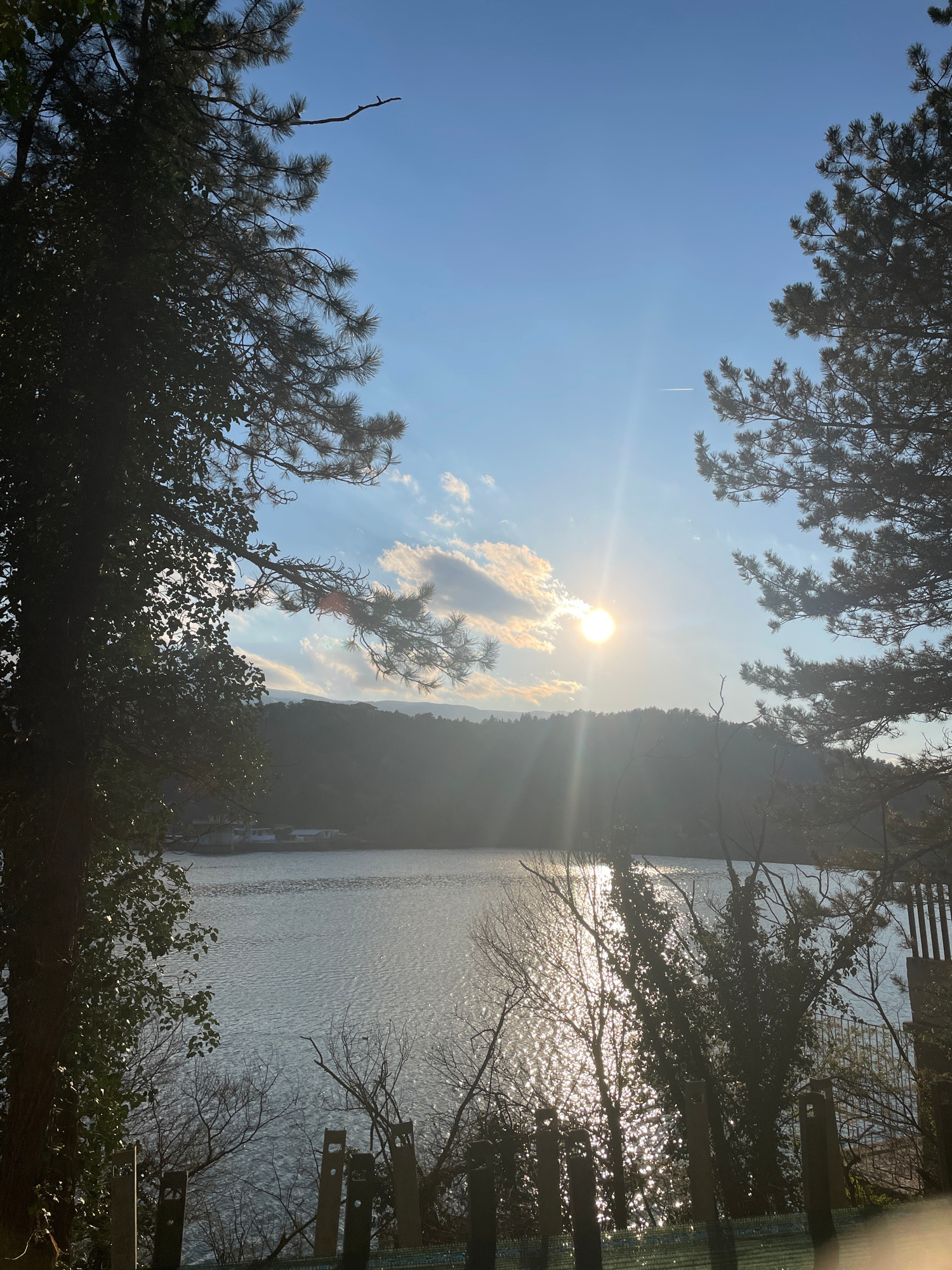 The image shows a view of Pancharevo Lake in Bulgaria, seen through trees. The sun is visible in the sky, with clouds nearby. The lake appears calm and reflects sunlight. A treeline is visible across…read more