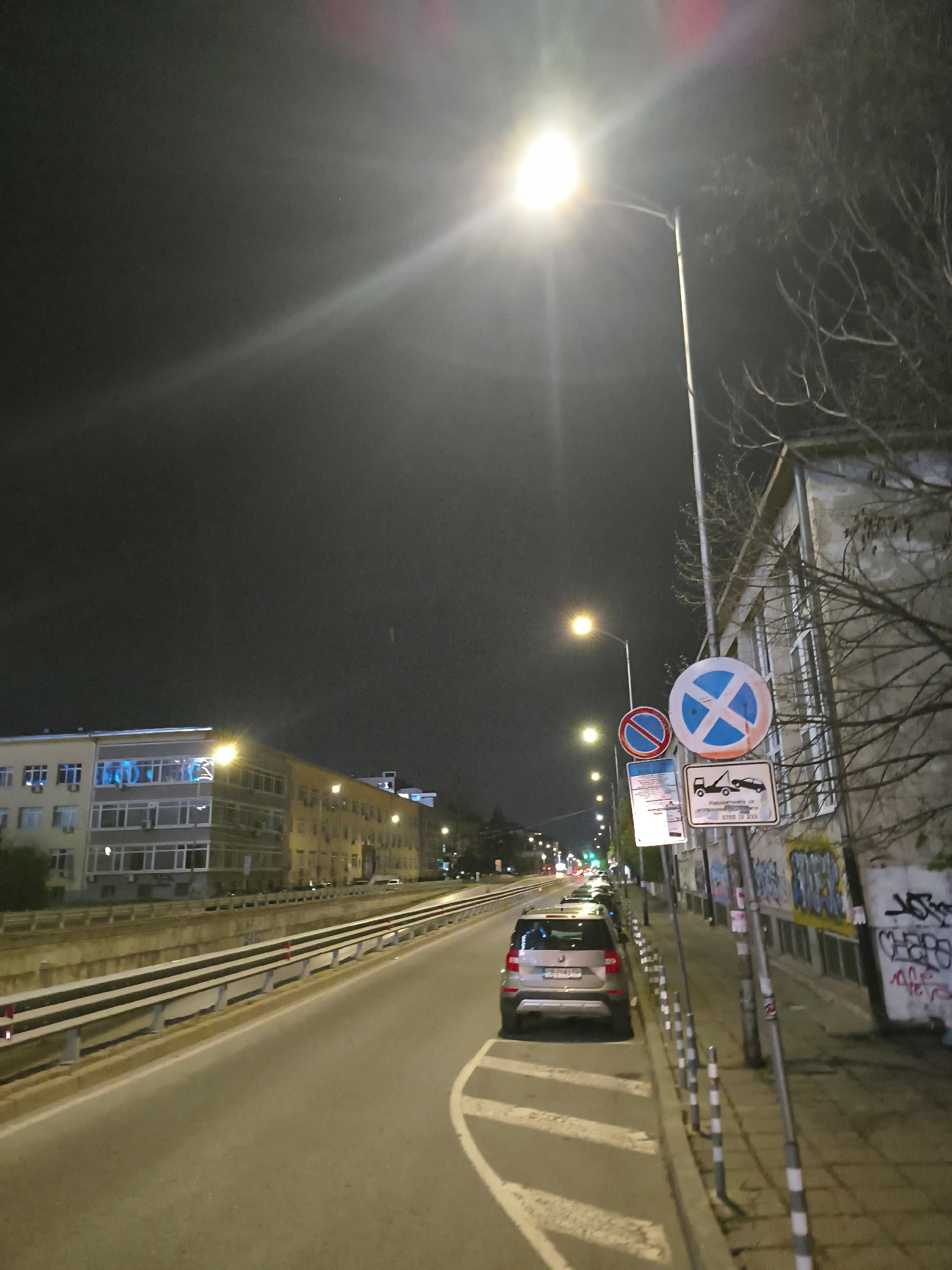 The image shows a street scene in Sofia, Bulgaria, at night. A white car is driving on the right side of the road. Traffic signs indicating "no stopping" and "no parking" are visible. Graffiti is presβ¦read more