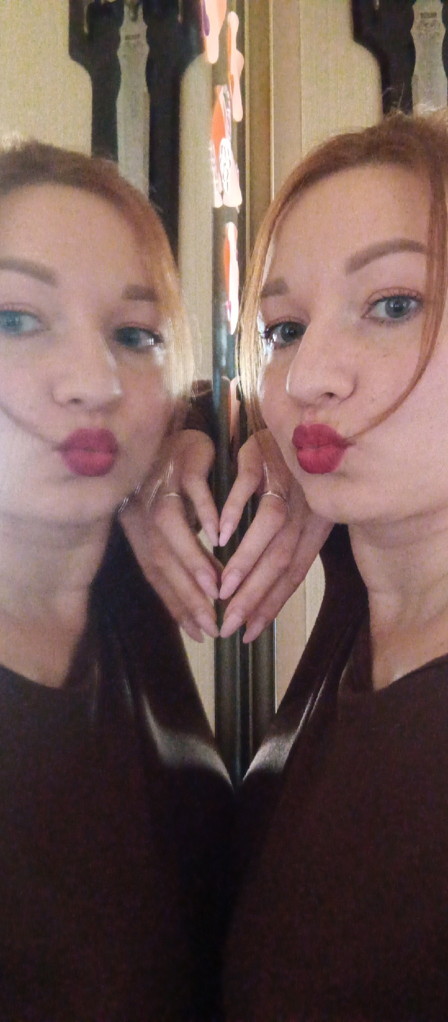 An indoor, eye-level mirror selfie features a woman with light reddish-brown hair and blue eyes, captured alongside her reflection. The image is split vertically by a dark line, indicating the edge of…read more