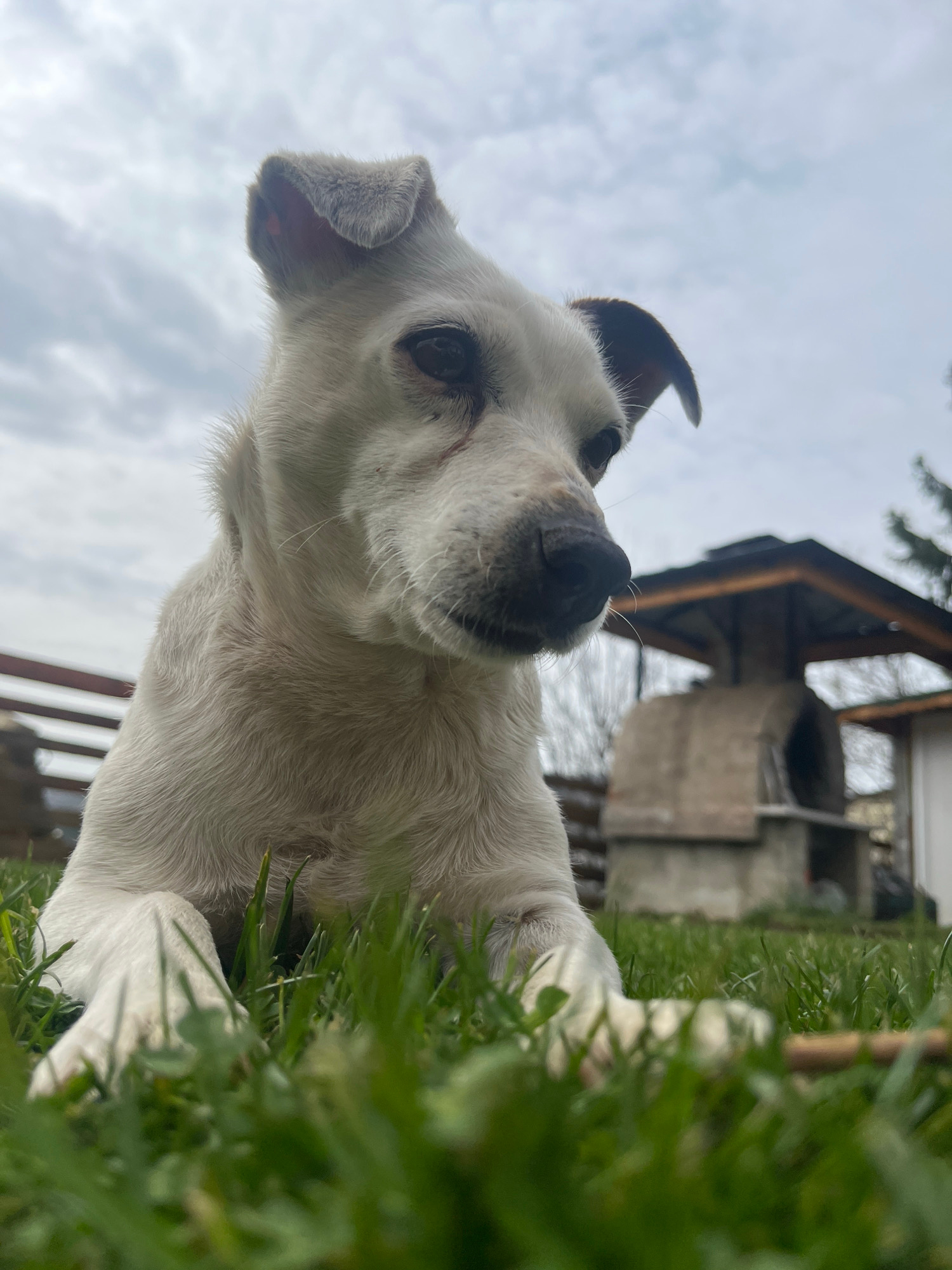 A low-angle close-up shot captures a white dog with short fur, looking directly at the camera with a gentle and curious expression. The dog's head is slightly tilted, showcasing its dark nose and one…read more