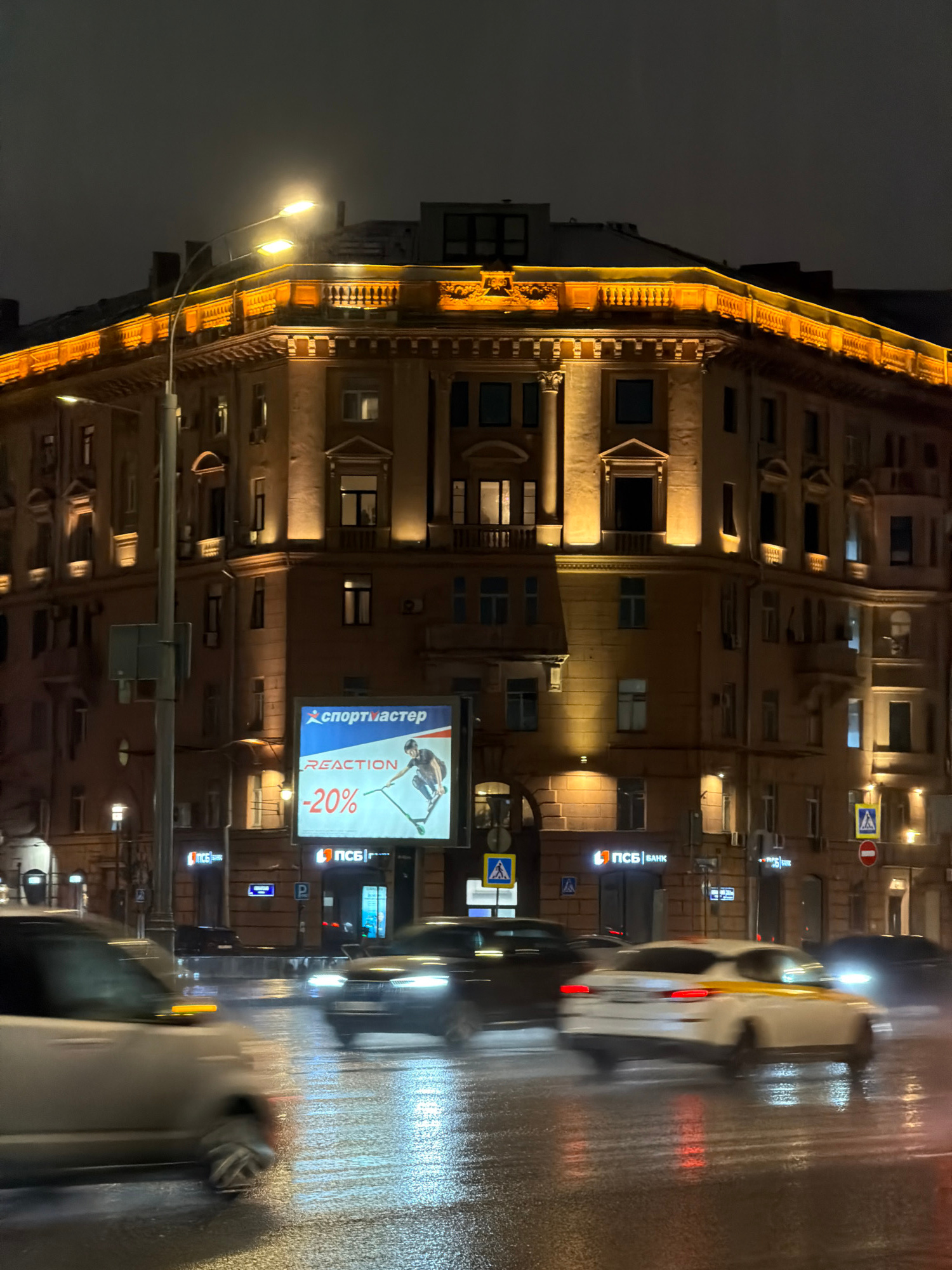 The image captures a nighttime scene in Moscow, Russia, likely along a street lined with historic buildings. The architecture of the building in the foreground features ornate details and is illuminat…read more