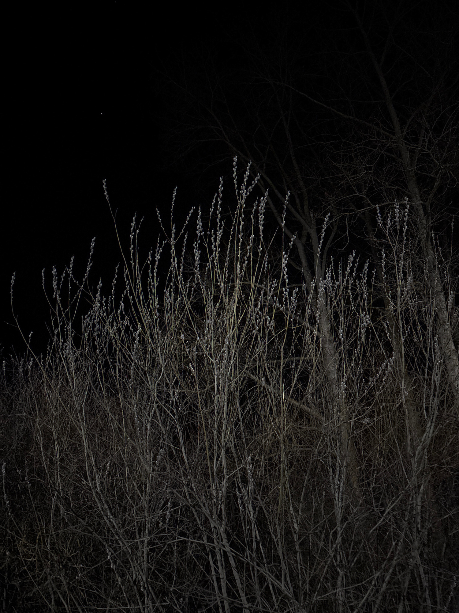 The image captures a nighttime scene in what appears to be a wooded or park-like area. Bare branches of trees, some with catkins, are silhouetted against the dark sky. The scene is predominantly dark,…read more