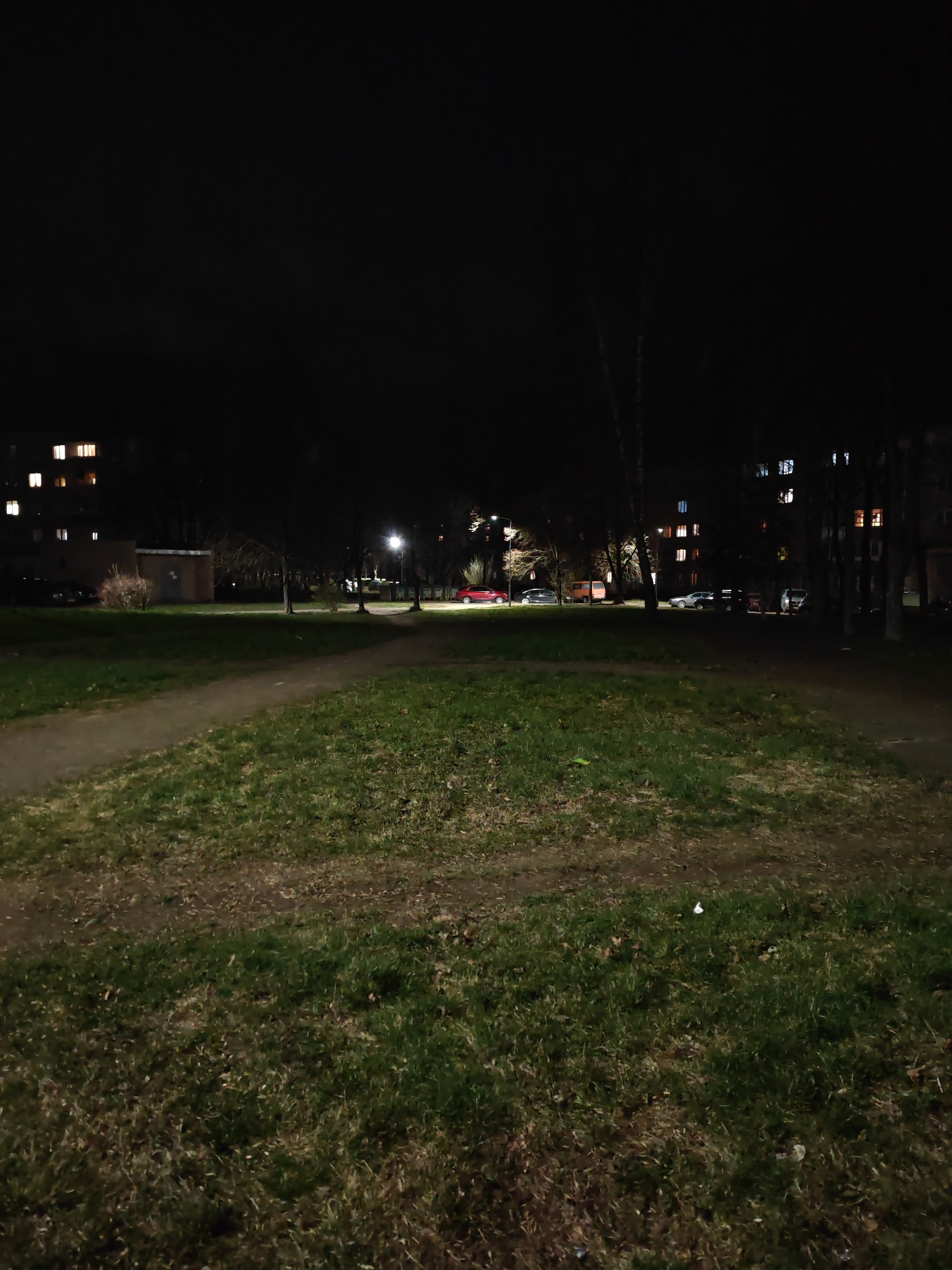 The image shows a nighttime scene in what appears to be a park or grassy area in an urban setting. There is no one apparent in this image. The foreground is dominated by grass with scattered leaves an…read more