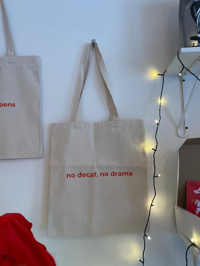 The image displays an interior scene, likely a room or retail space, featuring a white wall. Two beige canvas tote bags are visible. The central tote bag is suspended from a small, silver-colored hook…read more
