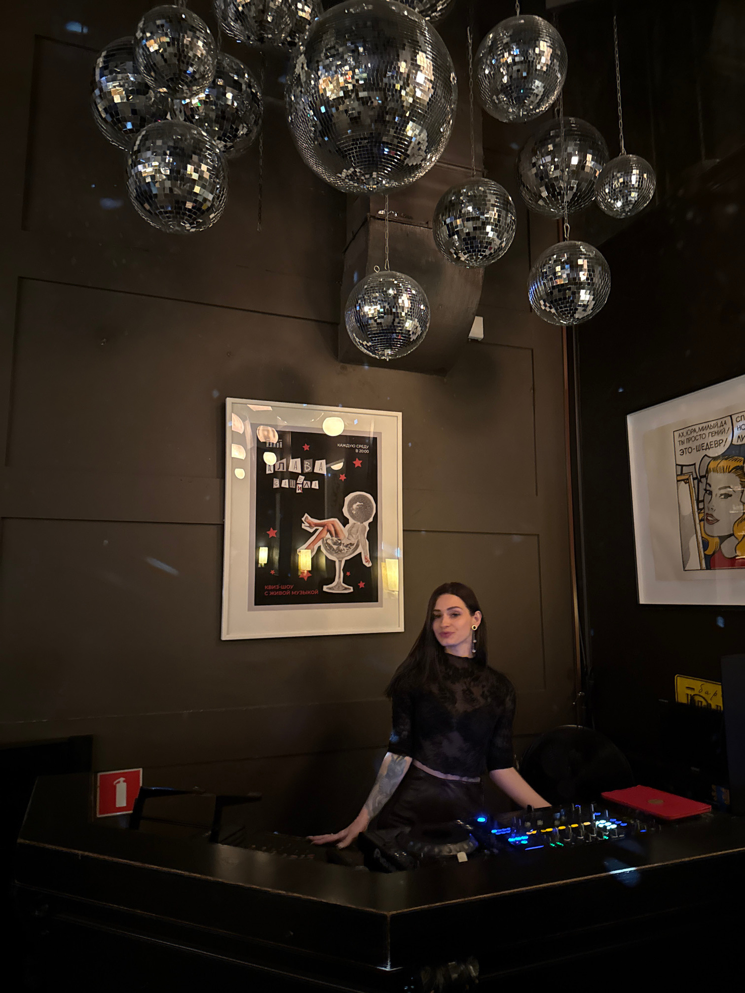 The image shows a DJ booth in what appears to be a bar or club, possibly located in Moscow, Russia, given the Cyrillic script on a comic-style framed print on the wall. A woman with long dark hair and…read more