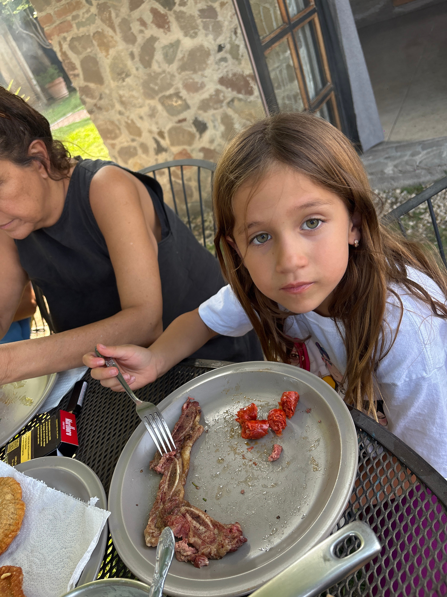 A girl with long brown hair is looking up at the camera next to a plate with meat and sausages on a metal table. A woman with dark hair is holding a fork and cutting the meat. A pack of Marlboro cigar…read more