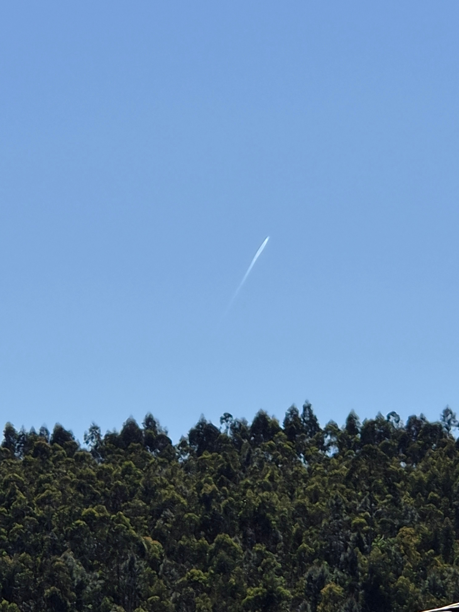 The image shows a clear blue sky with a visible contrail left by an airplane. A dense, dark green tree occupies the right side of the frame. The image does not provide any information to confirm if th…read more