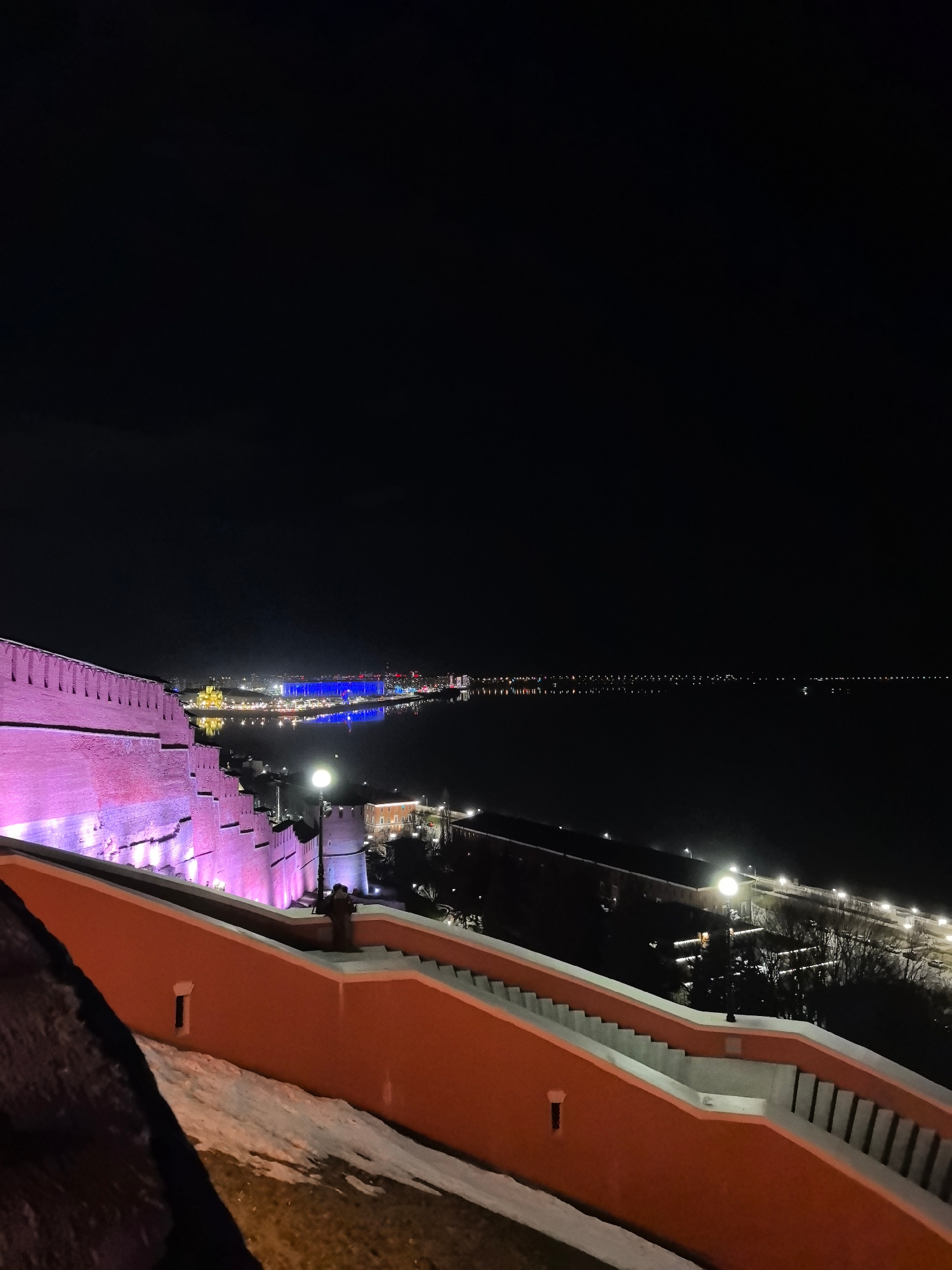 The image captures a night scene in Nizhny Novgorod, Russia. A portion of the Nizhny Novgorod Kremlin wall is illuminated with pink light on the left side of the frame. Adjacent to it, stairs with whi…read more