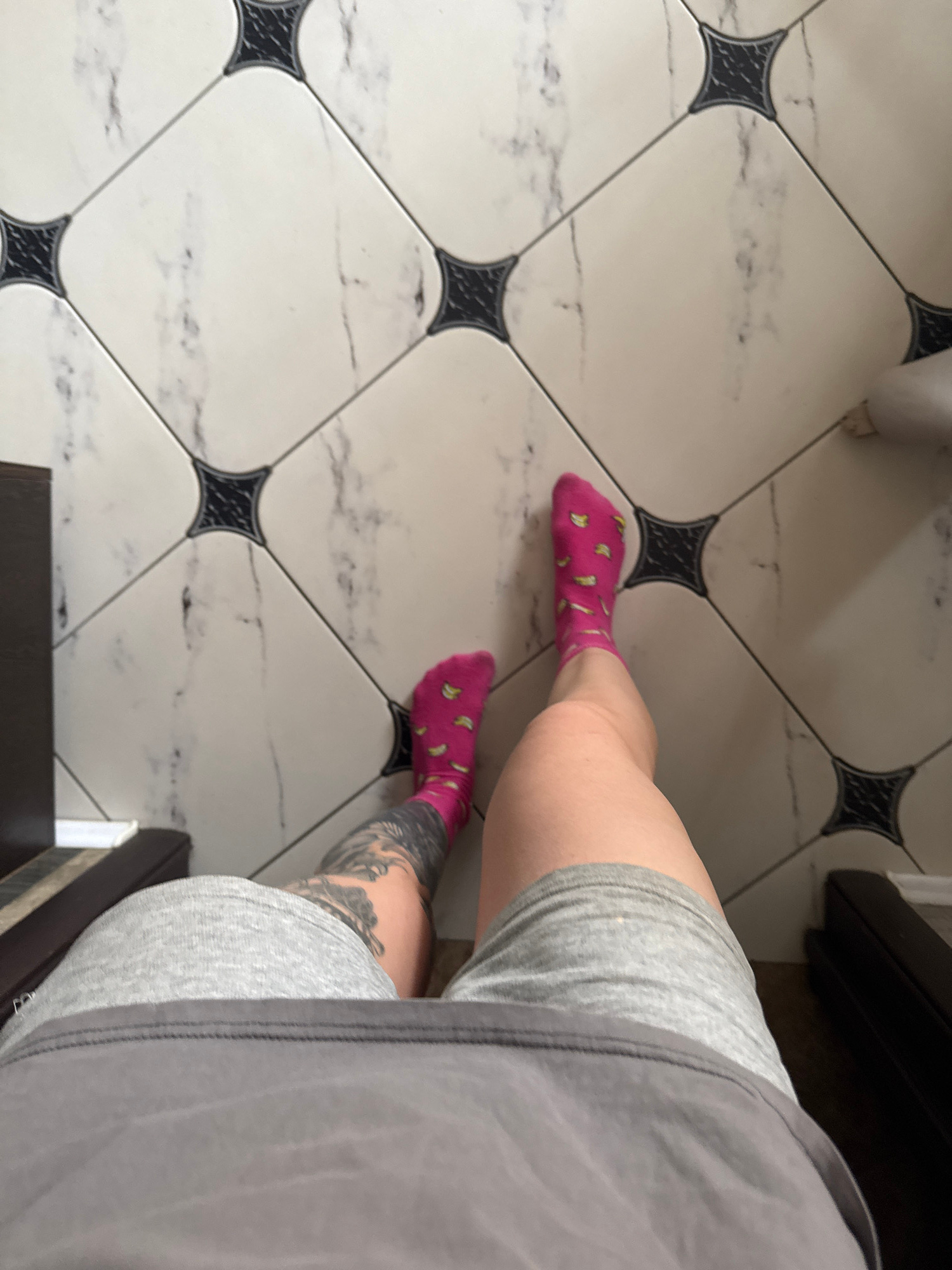 A top-down, slightly angled photograph shows a person's legs and part of their torso standing on a tiled floor. The floor tiles are square, white with black decorative elements at the corners, and hav…read more