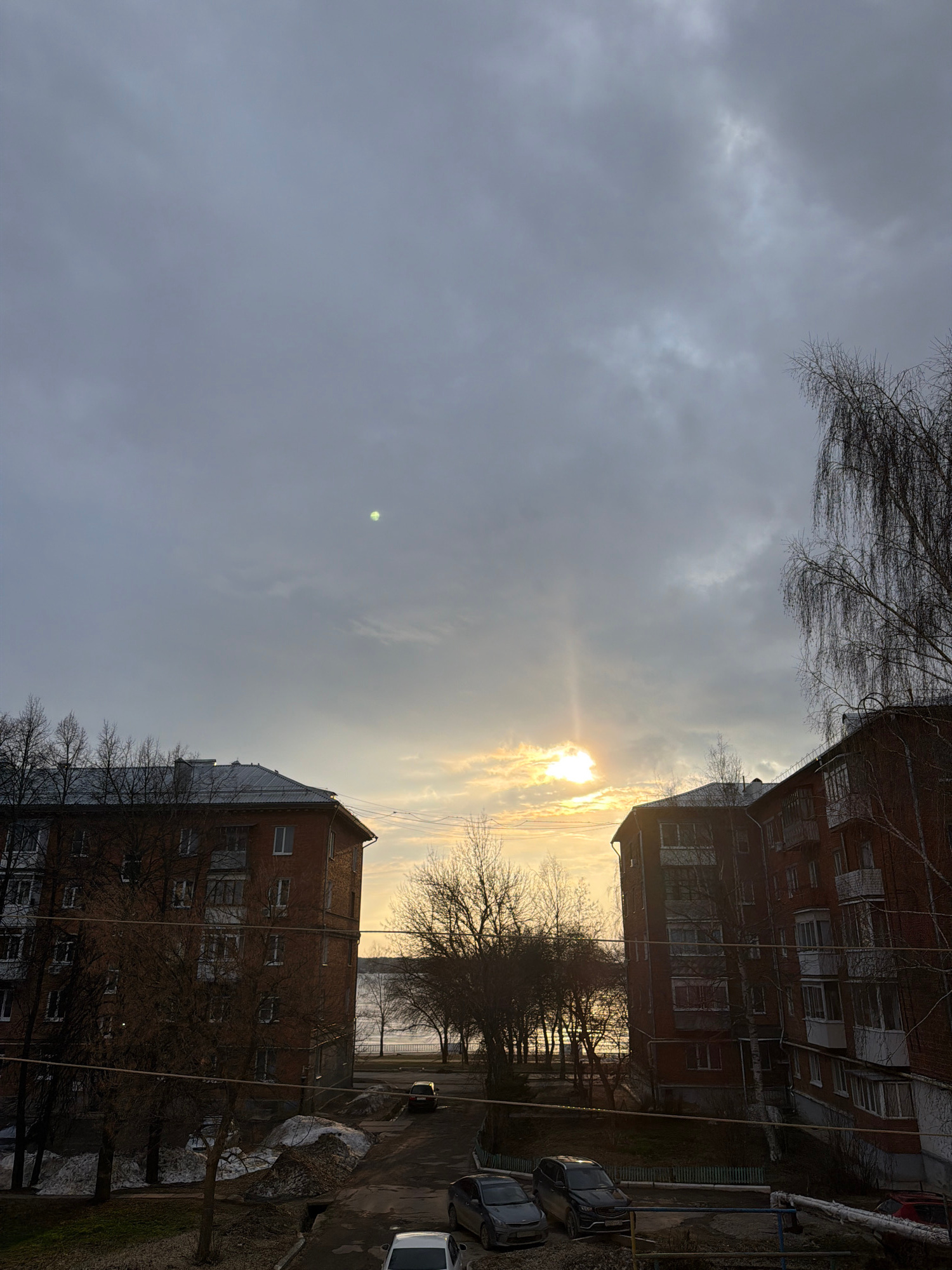 The image depicts an urban scene in Votkinsk, Russia, at sunset on an overcast day. Two brick apartment buildings frame a street with parked cars and bare trees. The sun is visible through a break in…read more