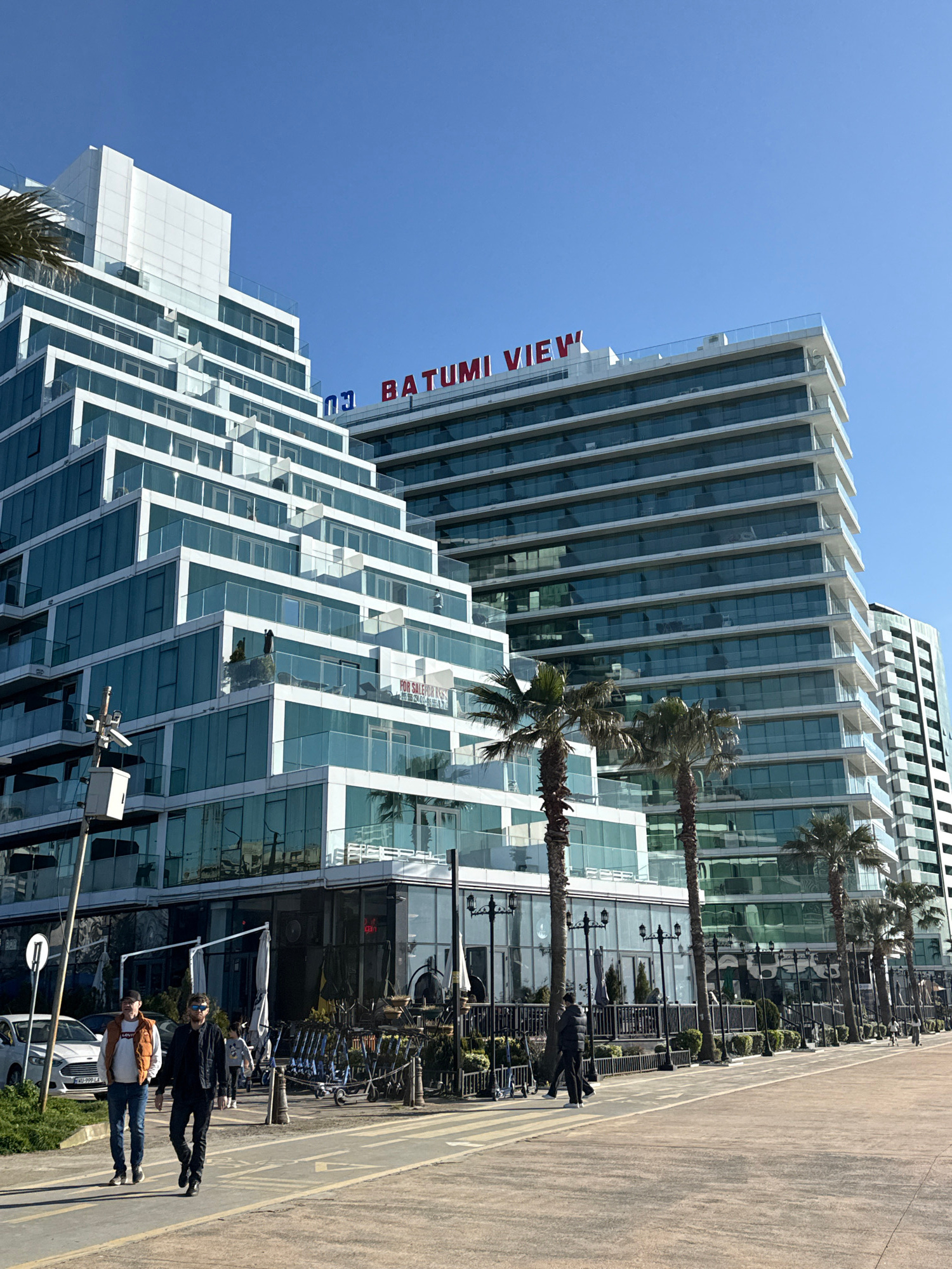 A daytime, high-angle shot captures a modern urban scene in Batumi, Georgia, featuring a distinctive high-rise building with a clear blue sky as its backdrop. The prominent building, emblazoned with t…read more
