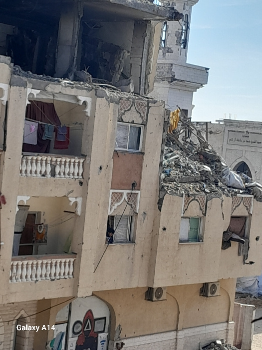 A partially destroyed building is visible. The structure reveals exposed rooms with personal items like laundry. Rubble and twisted metal protrude from the damaged sections. Adjacent to the ruined por…read more