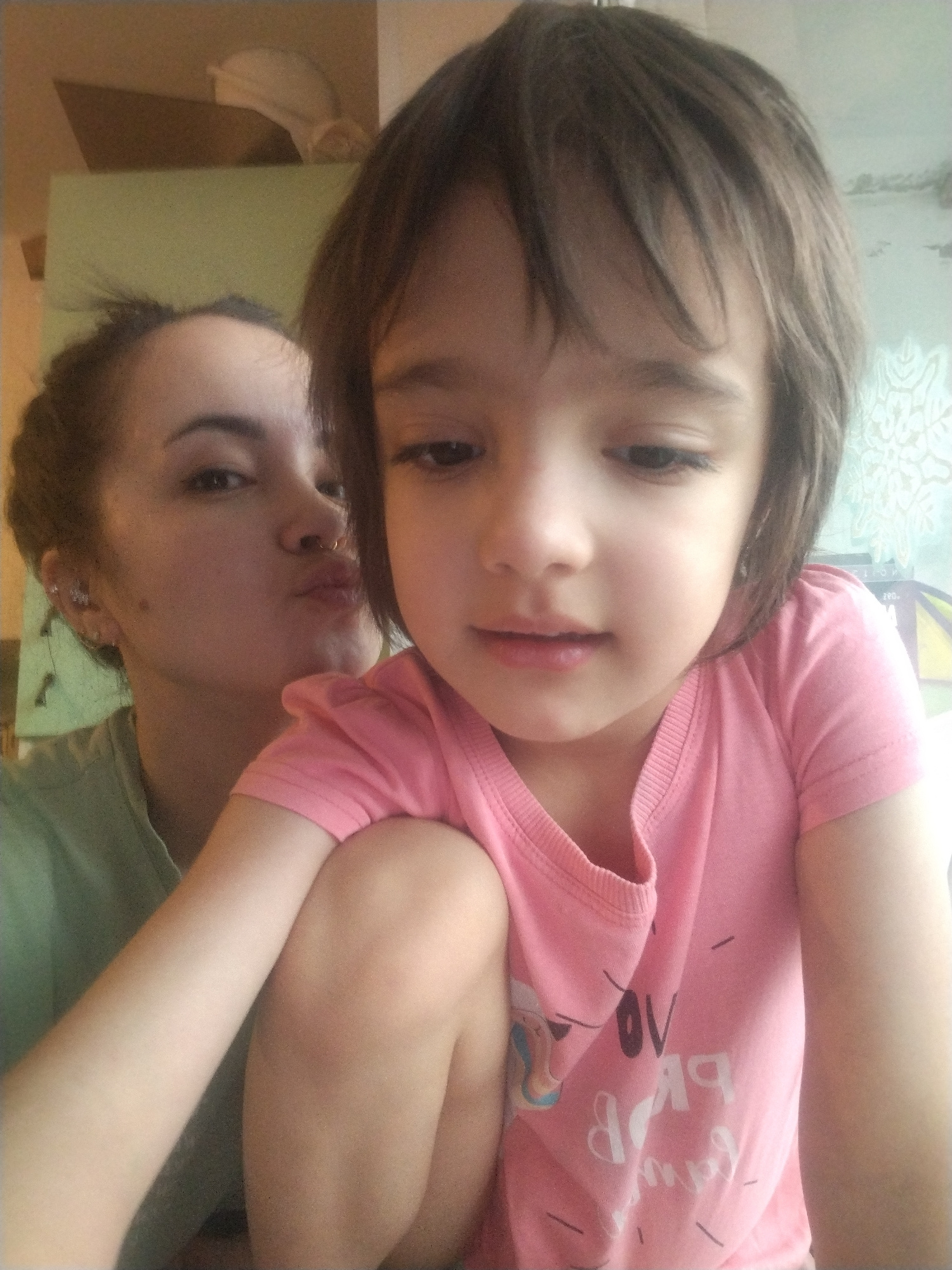 Two individuals are in an interior setting, possibly a residence. A child is positioned in the foreground, wearing a pink short-sleeved shirt with a graphic design. The child has short brown hair and…read more