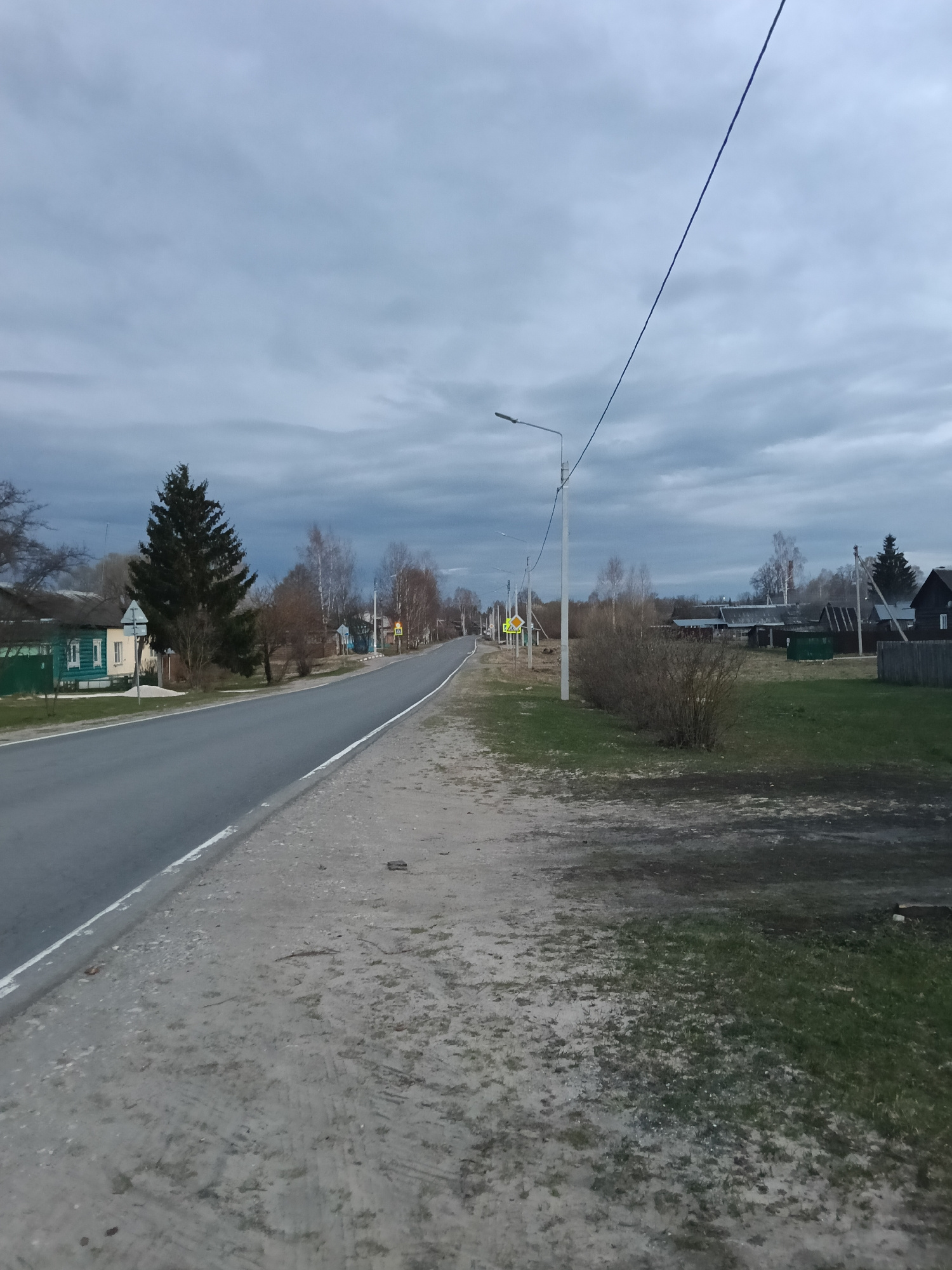The image captures a quiet, semi-rural road scene in Красный Маяк, Russia, under an overcast, gray sky. The time of day appears to be late afternoon or early evening, or a heavily clouded daylight, re…read more