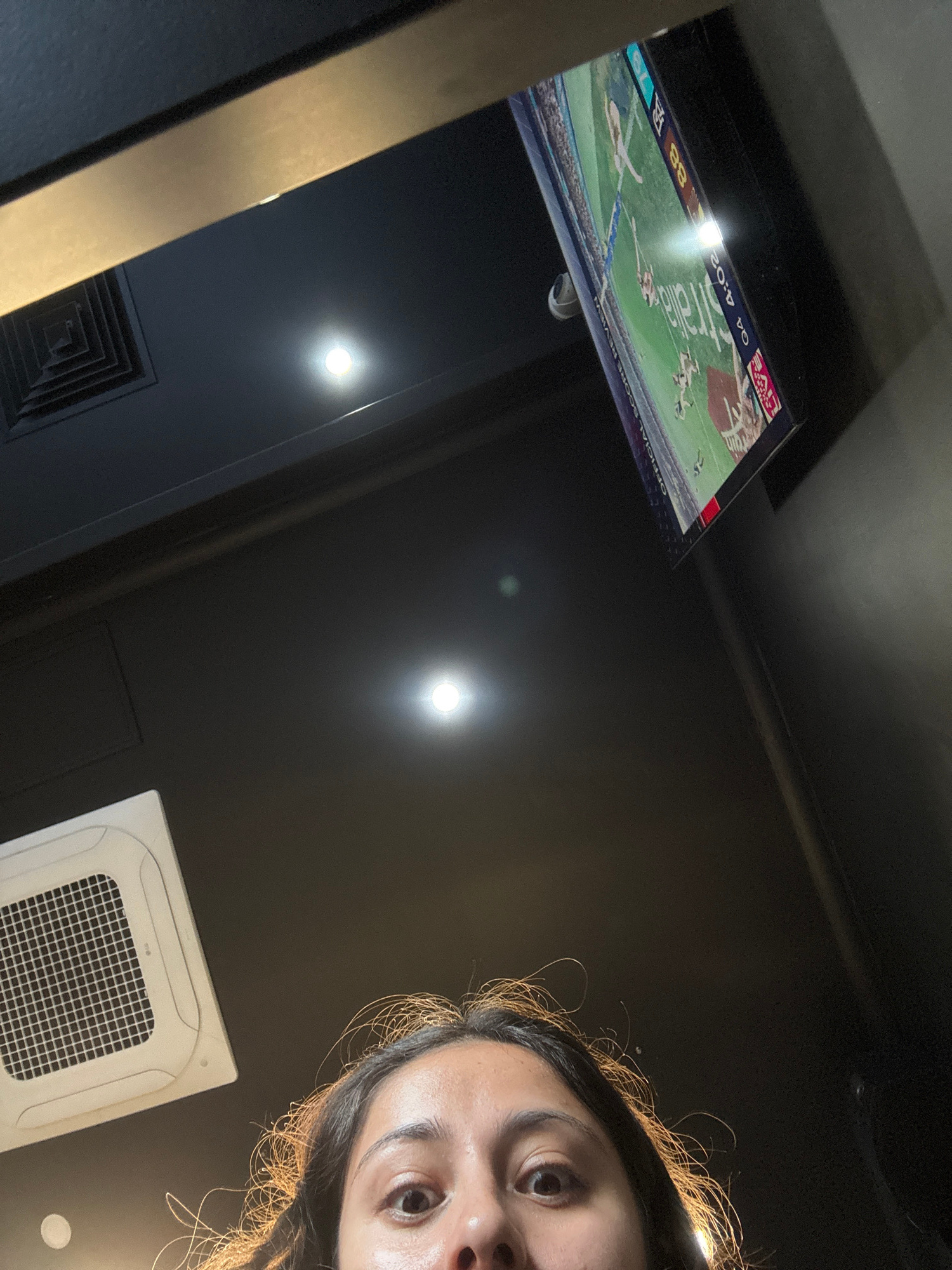 An upward-angled, low-light shot captures an indoor setting, likely in Bicton, Australia, with a focus on a television screen and a person's partially visible face. The person, positioned in the top r…read more