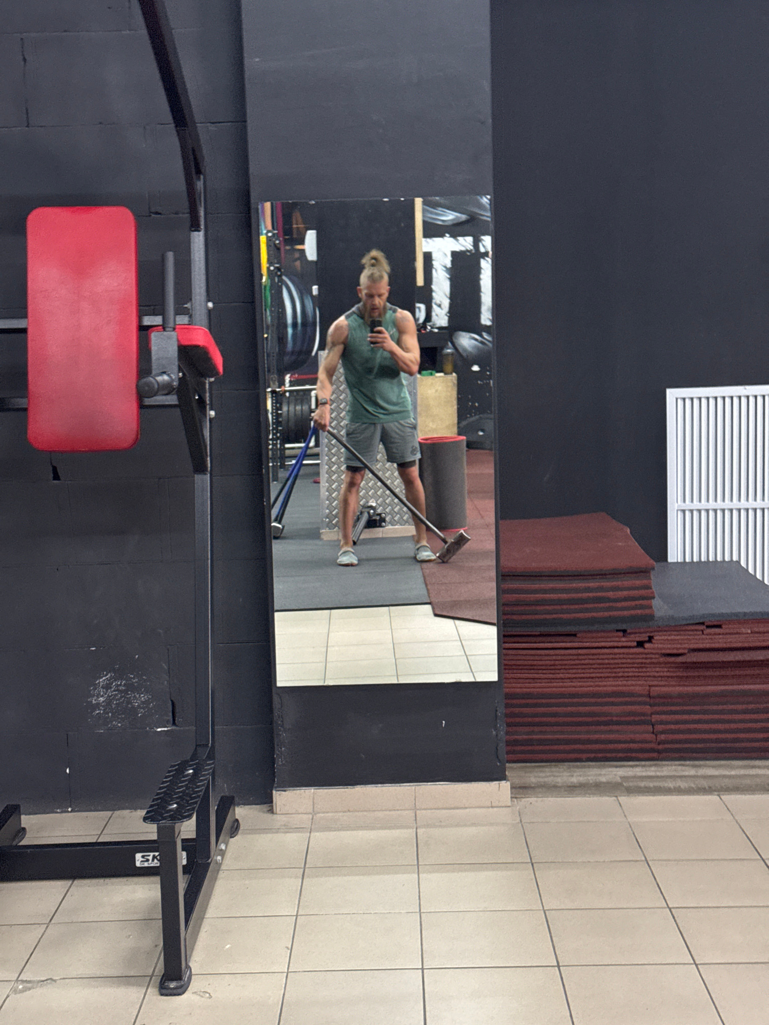 The image shows a gym setting. A man is reflected in a mirror, holding a blue resistance band attached to a barbell. He is wearing a green t-shirt and grey shorts with sneakers. In front of the mirror…read more