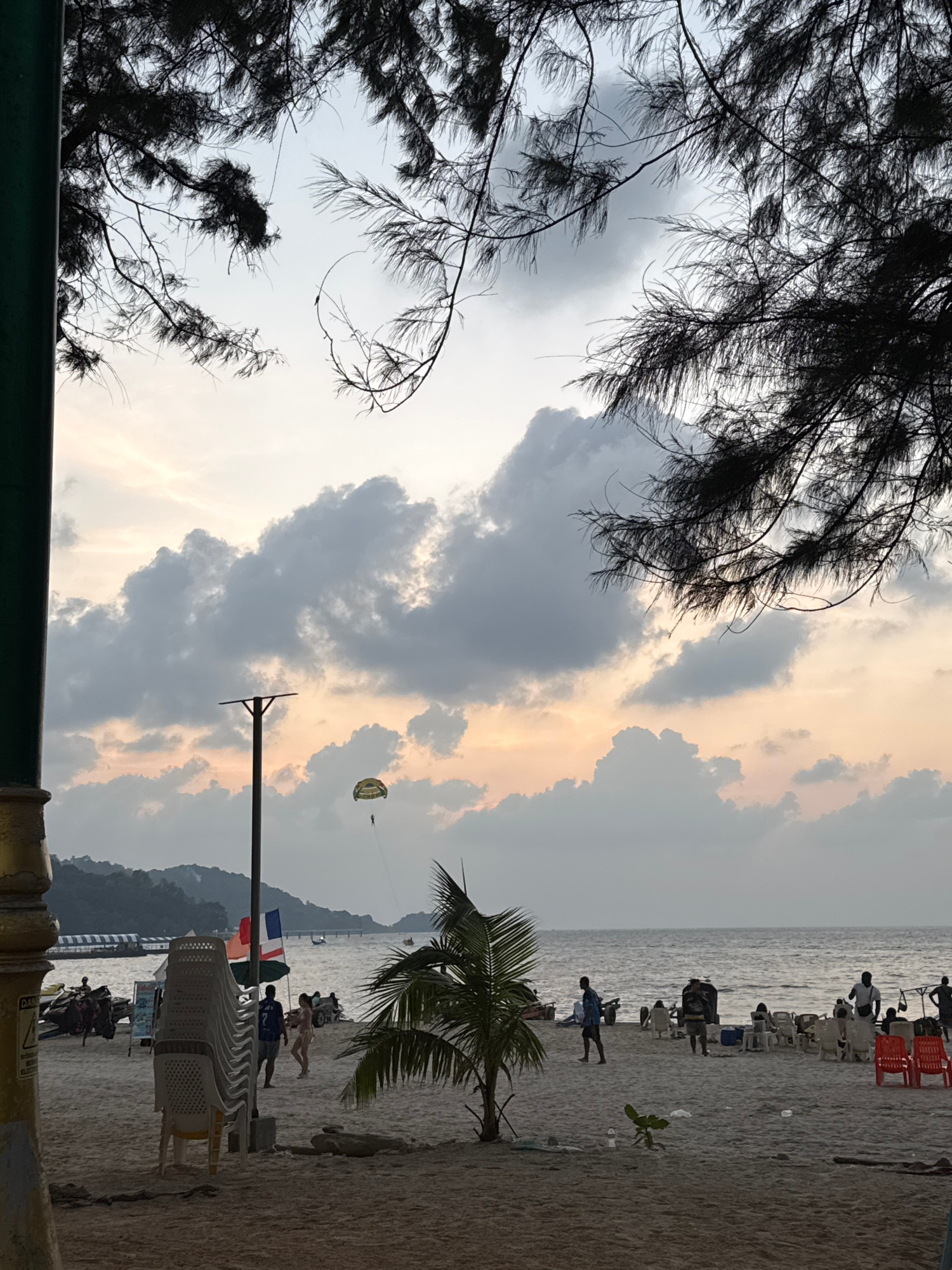 The image depicts a beach scene in Patong, Thailand. The sky is filled with clouds with hints of sunset color, and a parasail is visible in the distance. A palm tree is on the right. A beach with peop…read more