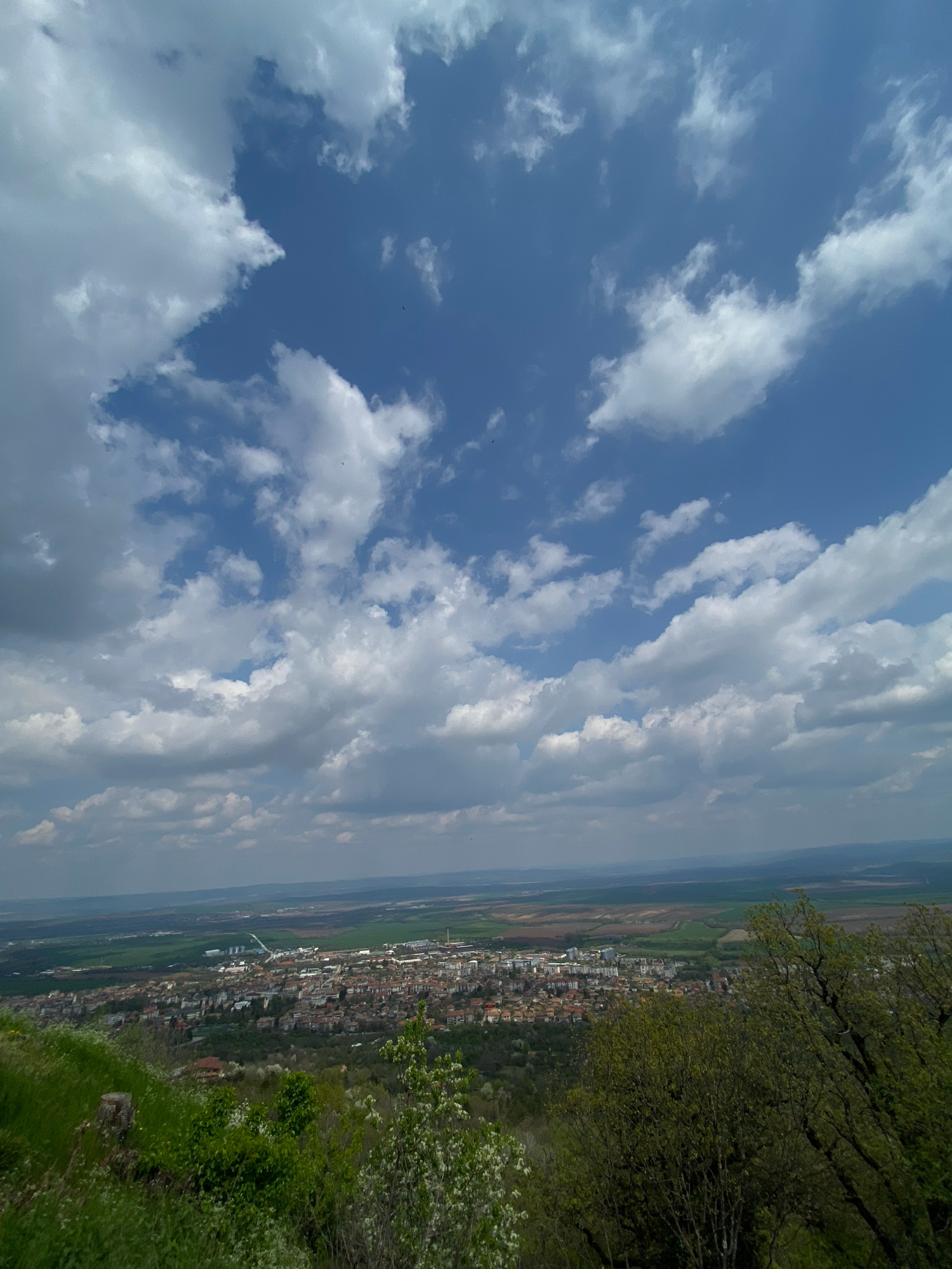 The image presents a panoramic view from a high vantage point in Lyaskovets, Bulgaria. The foreground on the left shows lush greenery consisting of trees and grass, suggesting a hillside or elevated a…read more