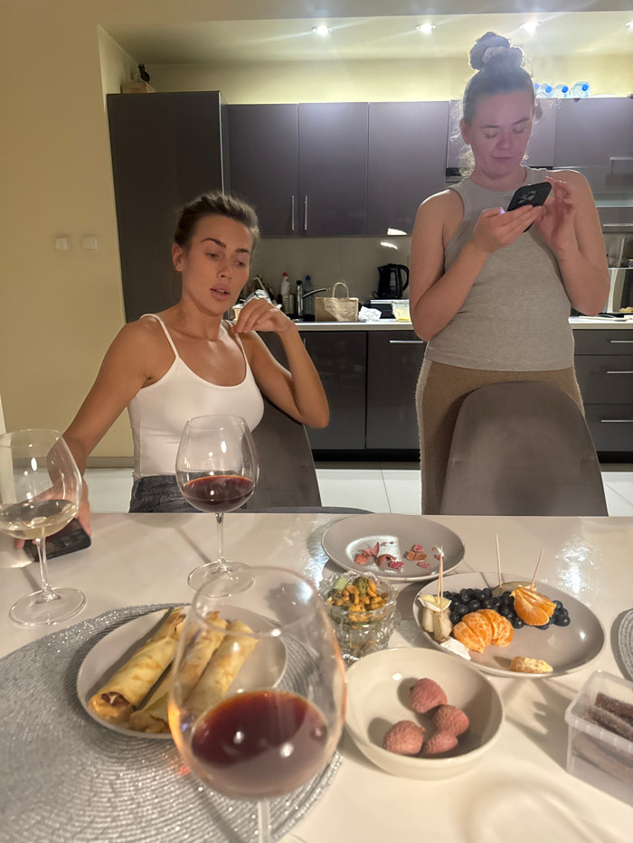 Two women are in a kitchen near a dining table. One woman wears a gray top and holds a phone. The other, dressed in a white top, sits at the table, also holding a phone. The table is set with various…read more