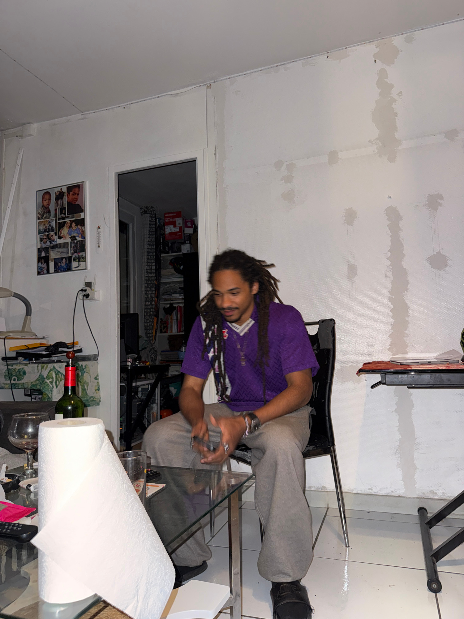 A man with dreadlocks sits in a black chair next to a glass coffee table in a room. He wears a purple shirt and grey sweatpants. The coffee table has a roll of paper towels, a bottle of wine, glasses,…read more