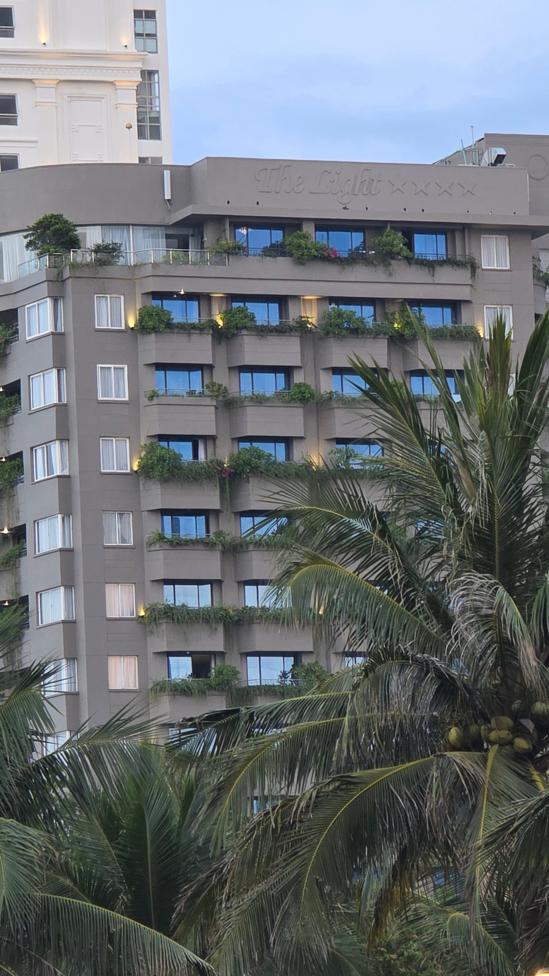A modern, multi-story building, likely a hotel or apartment complex, stands prominently under a clear, light blue sky. The building, oriented vertically in the actual scene, features a grey facade ado…read more