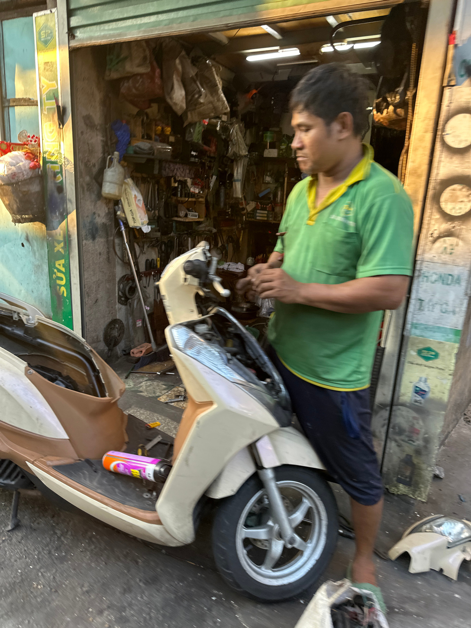 A man in a green and yellow t-shirt is working on a moped at a repair shop. The moped is light beige with brown accents. The front of the moped is disassembled, with the headlight lying nearby. Variou…read more