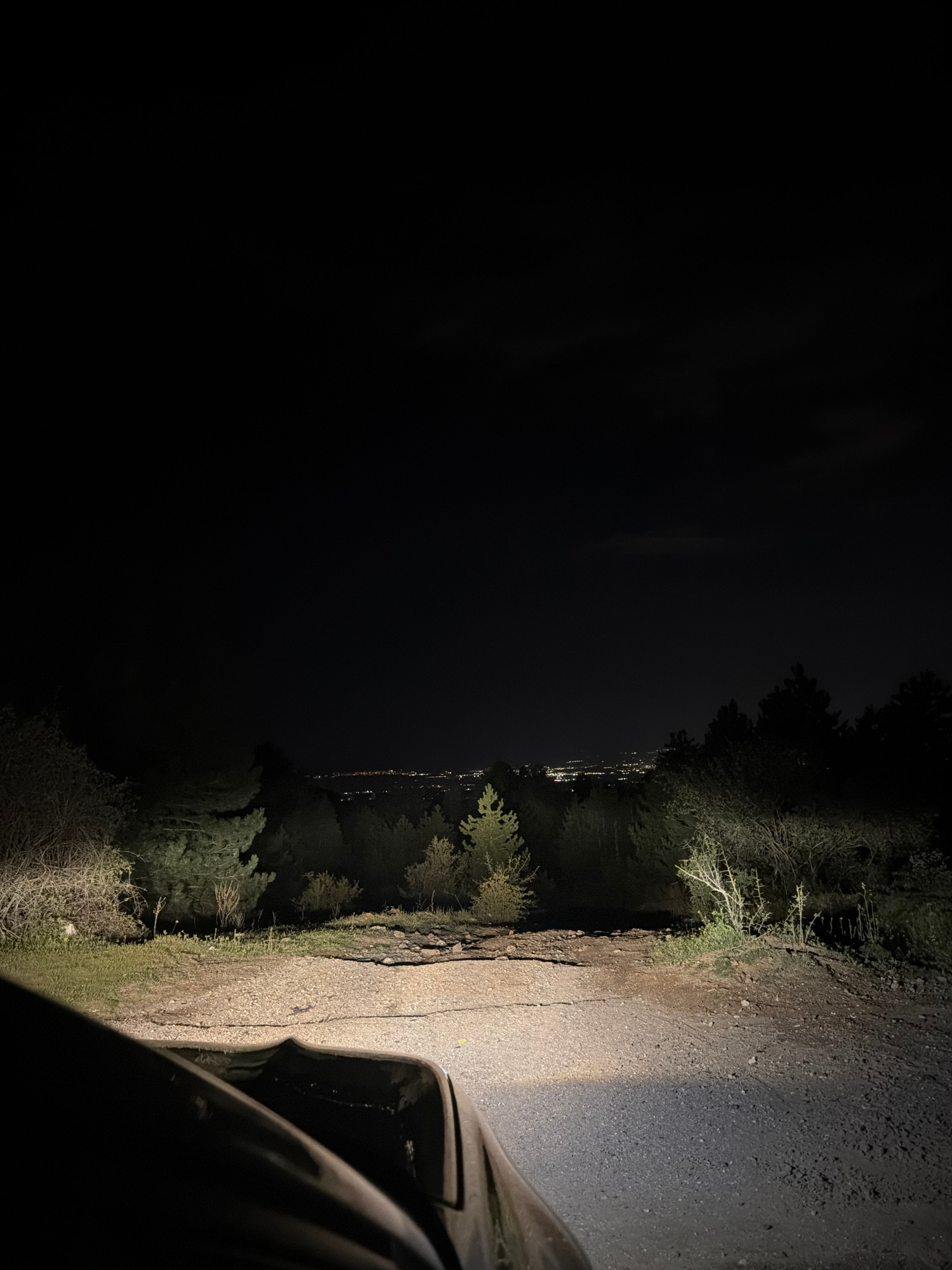The image depicts a nighttime scene. A narrow, unpaved road is illuminated by the headlights of a vehicle, partially visible on the right. The road is bordered by vegetation on one side and darkness o…read more