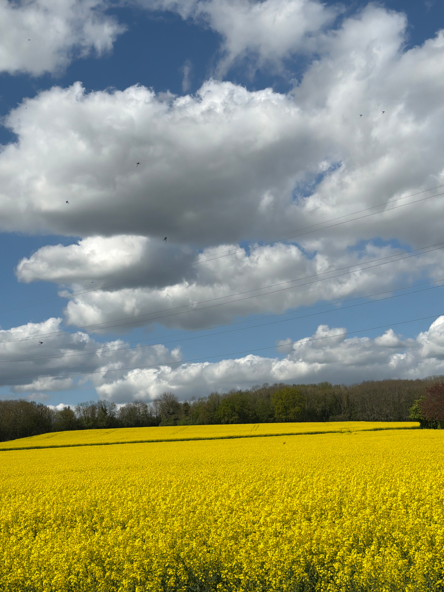 The image captures a vibrant rural landscape in Maidstone, United Kingdom, under a bright, partly cloudy sky. A vast field of brilliant yellow rapeseed (canola) flowers dominates the lower and right p…read more