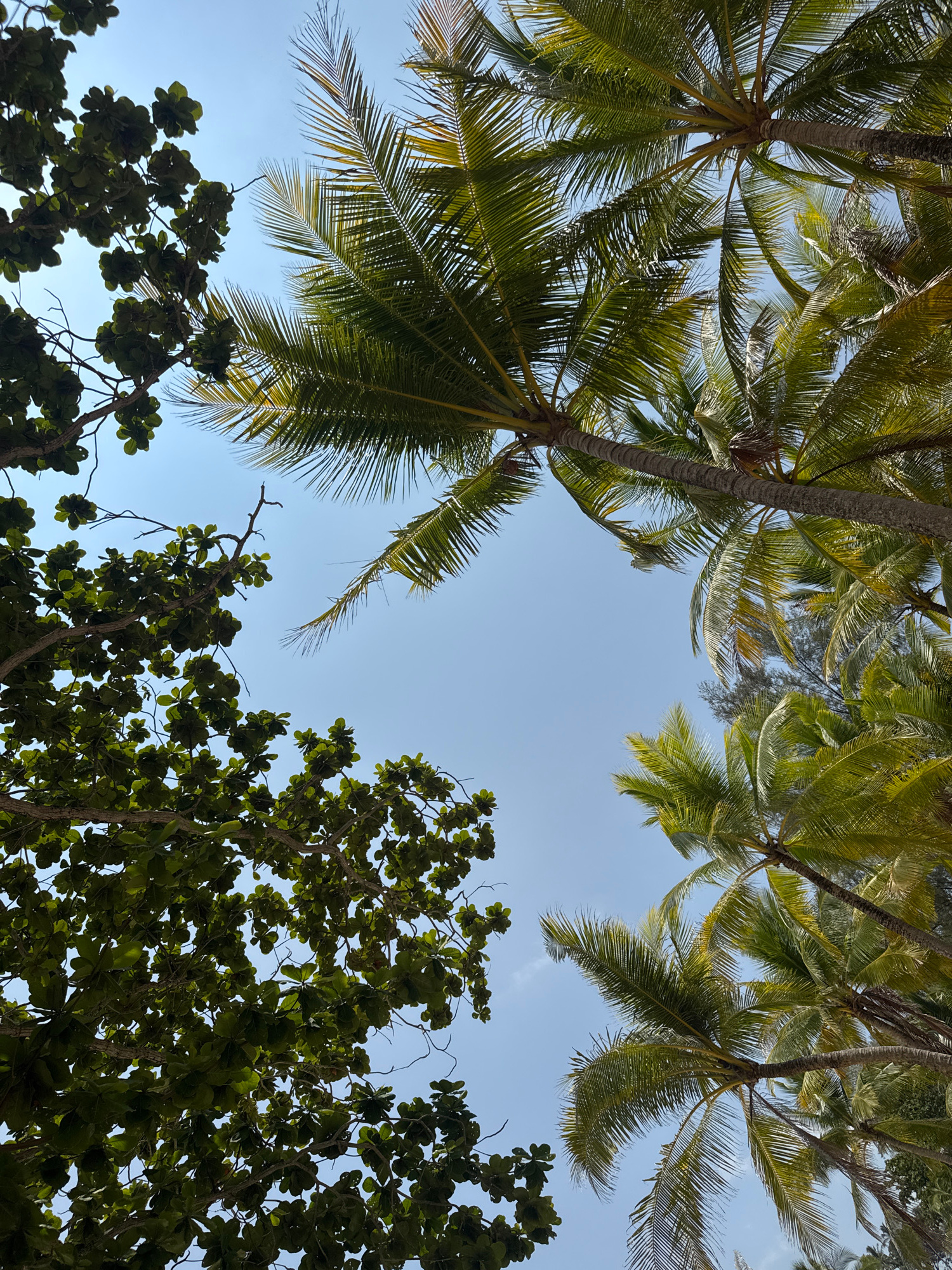 This image presents a low-angle, upward-facing view into a tropical tree canopy against a clear blue sky. The dominant subjects are several tall palm trees, likely coconut palms, positioned around the…read more