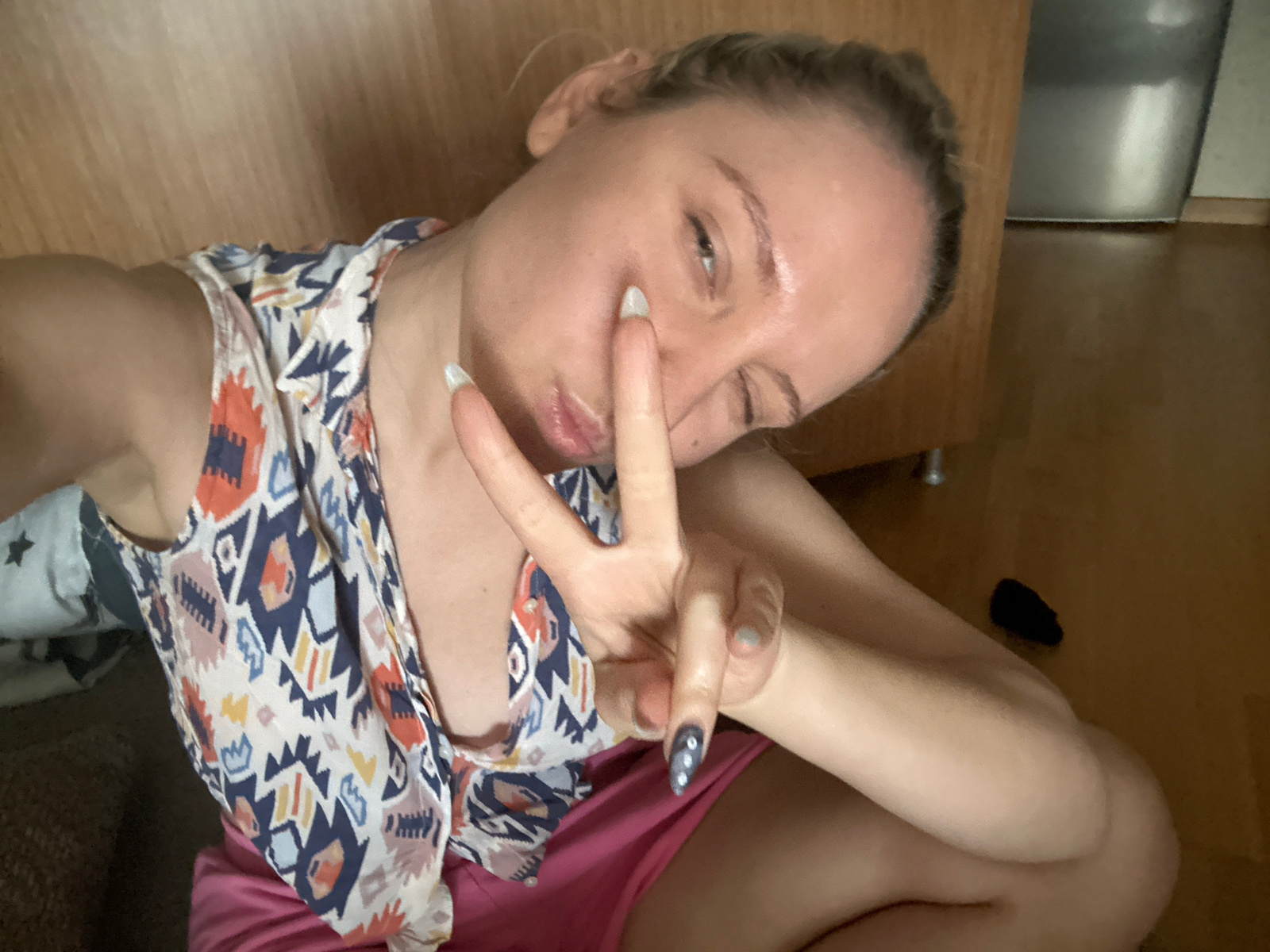 A woman with light skin is lying on a wooden surface, possibly a floor, in an indoor setting. She is wearing a colorful patterned shirt and pink shorts. Her right hand is raised, making a peace sign wβ¦read more