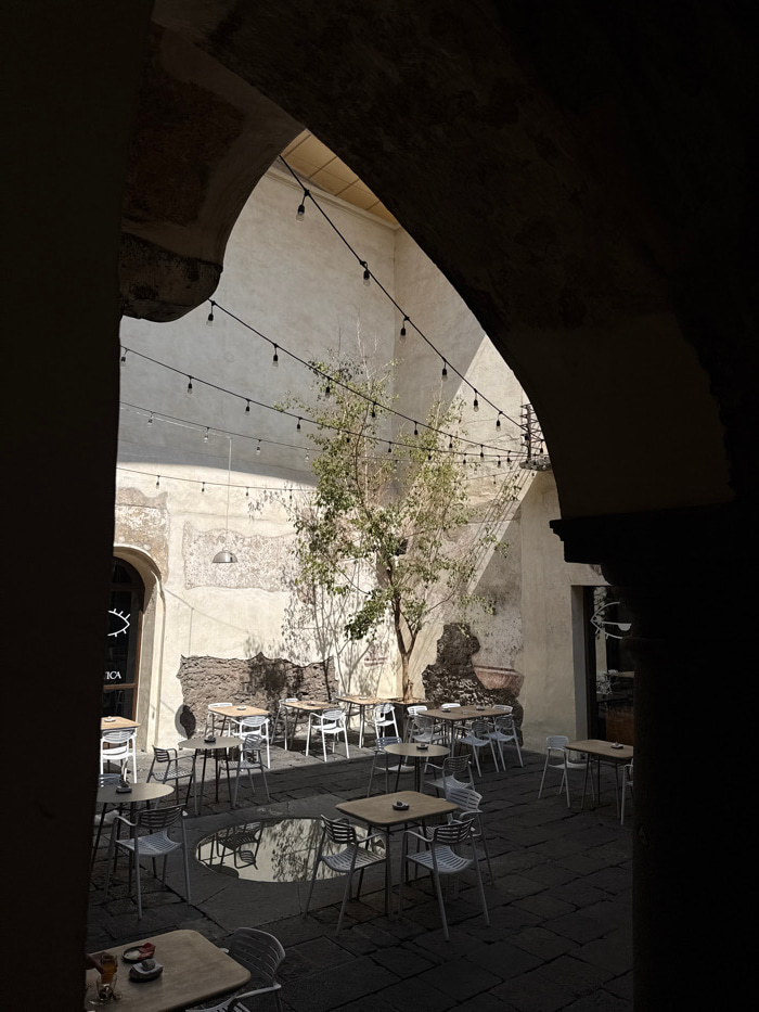 The image depicts an unoccupied outdoor courtyard, likely a cafe or restaurant patio, located in the city of Puebla, Mexico. The scene is framed by a dark, arched entryway or colonnade, which borders…read more