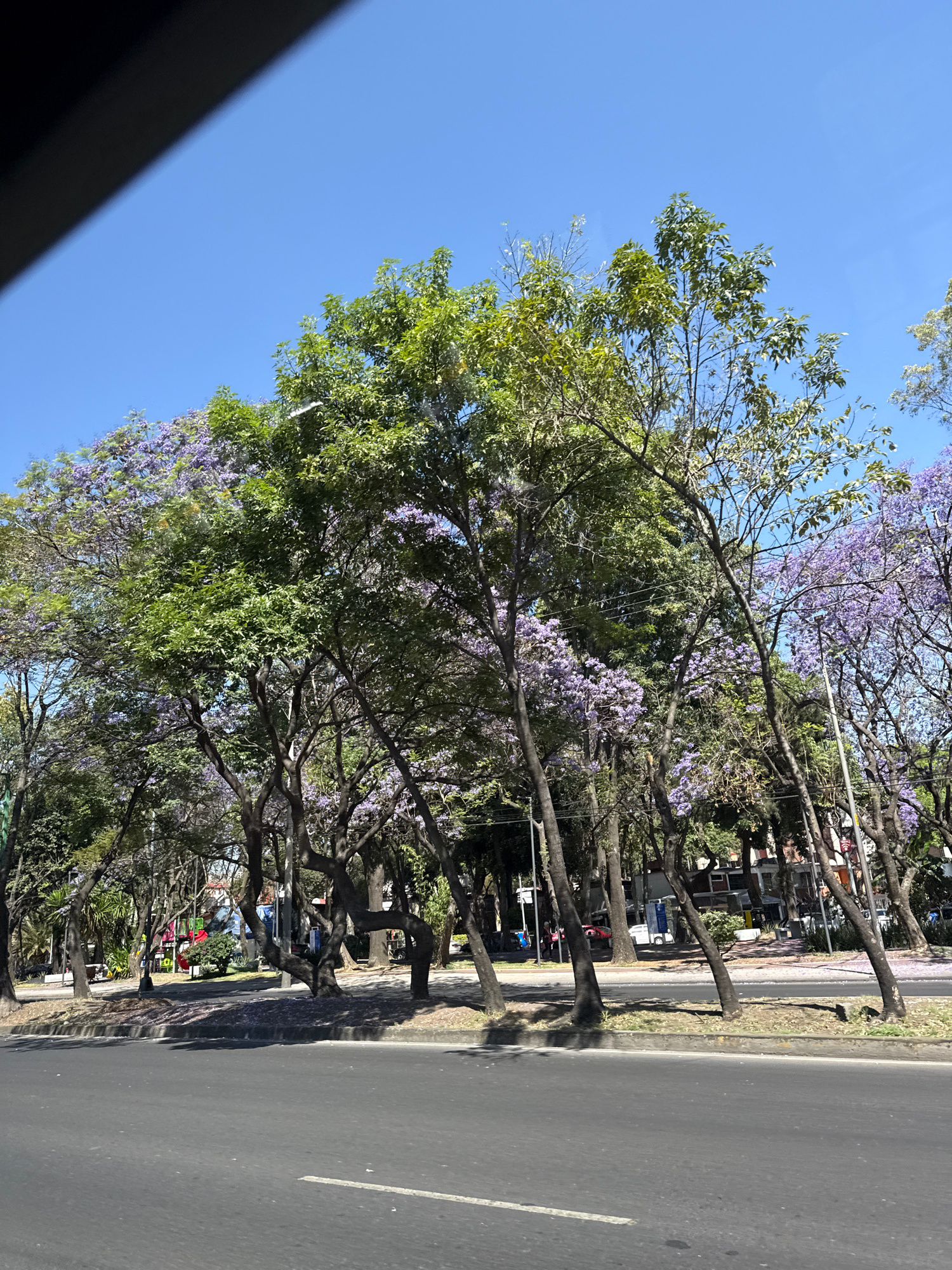 The image shows a street in Mexico City lined with Jacaranda trees in bloom, distinguished by their characteristic purple flowers. The trees cast shadows on the street and sidewalk, where parked cars,…read more