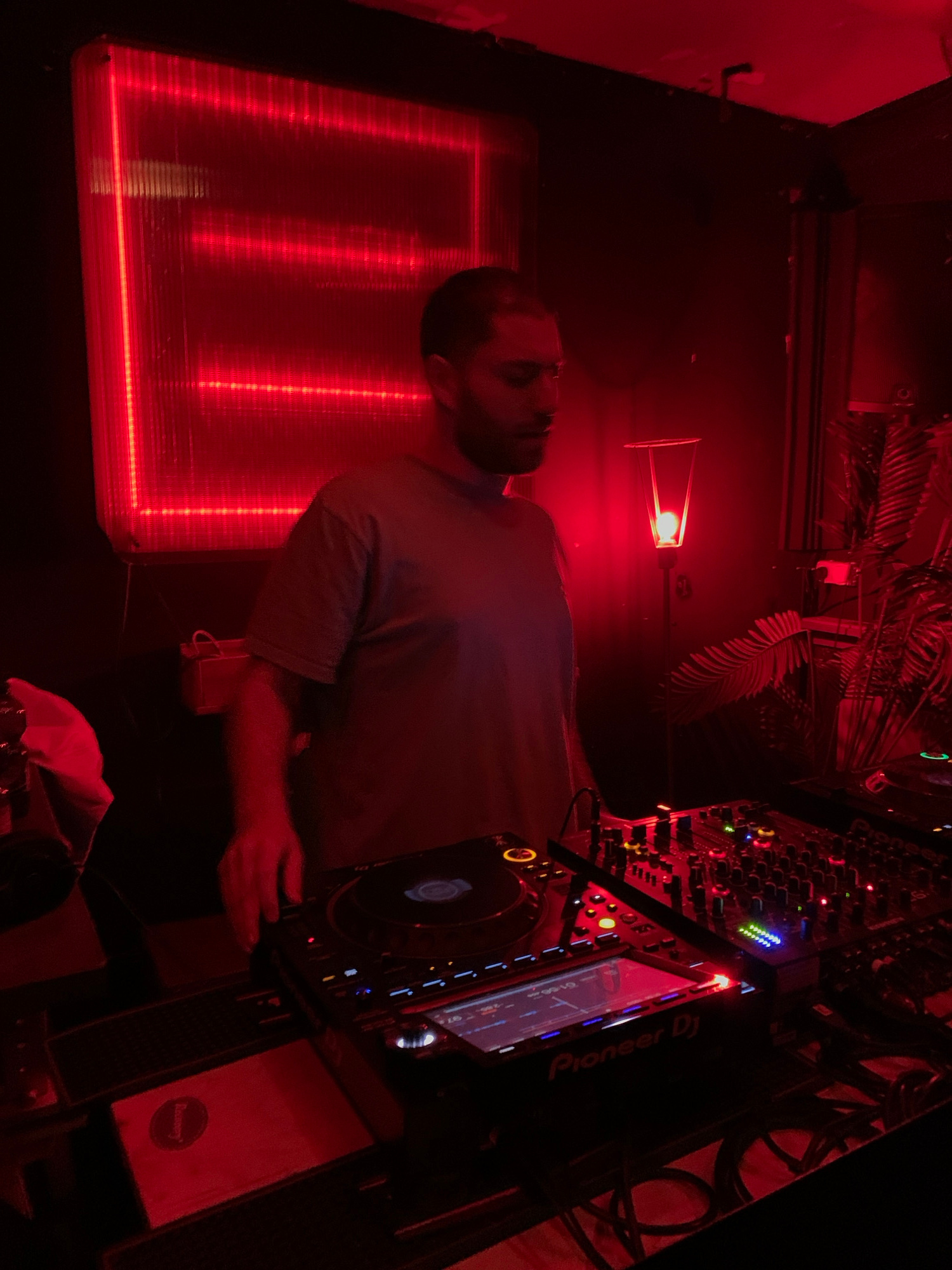 The image depicts a DJ working in a dimly lit setting, possibly a nightclub or a bar. The DJ, a man with short hair and a beard, is positioned behind a Pioneer DJ setup, which includes a mixer and CDJ…read more