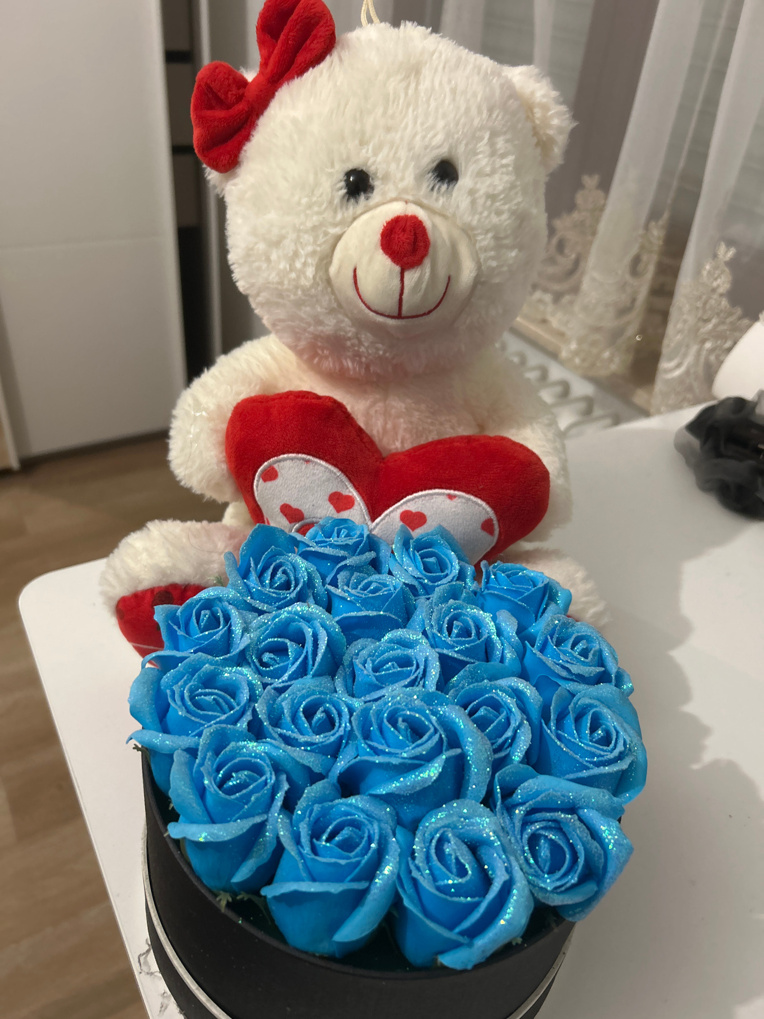 A white teddy bear with a red bow and heart-shaped hands holds a black box filled with blue roses. The scene appears to be indoors. No evidence suggests that this image was taken in Karlsruhe, Germany…read more