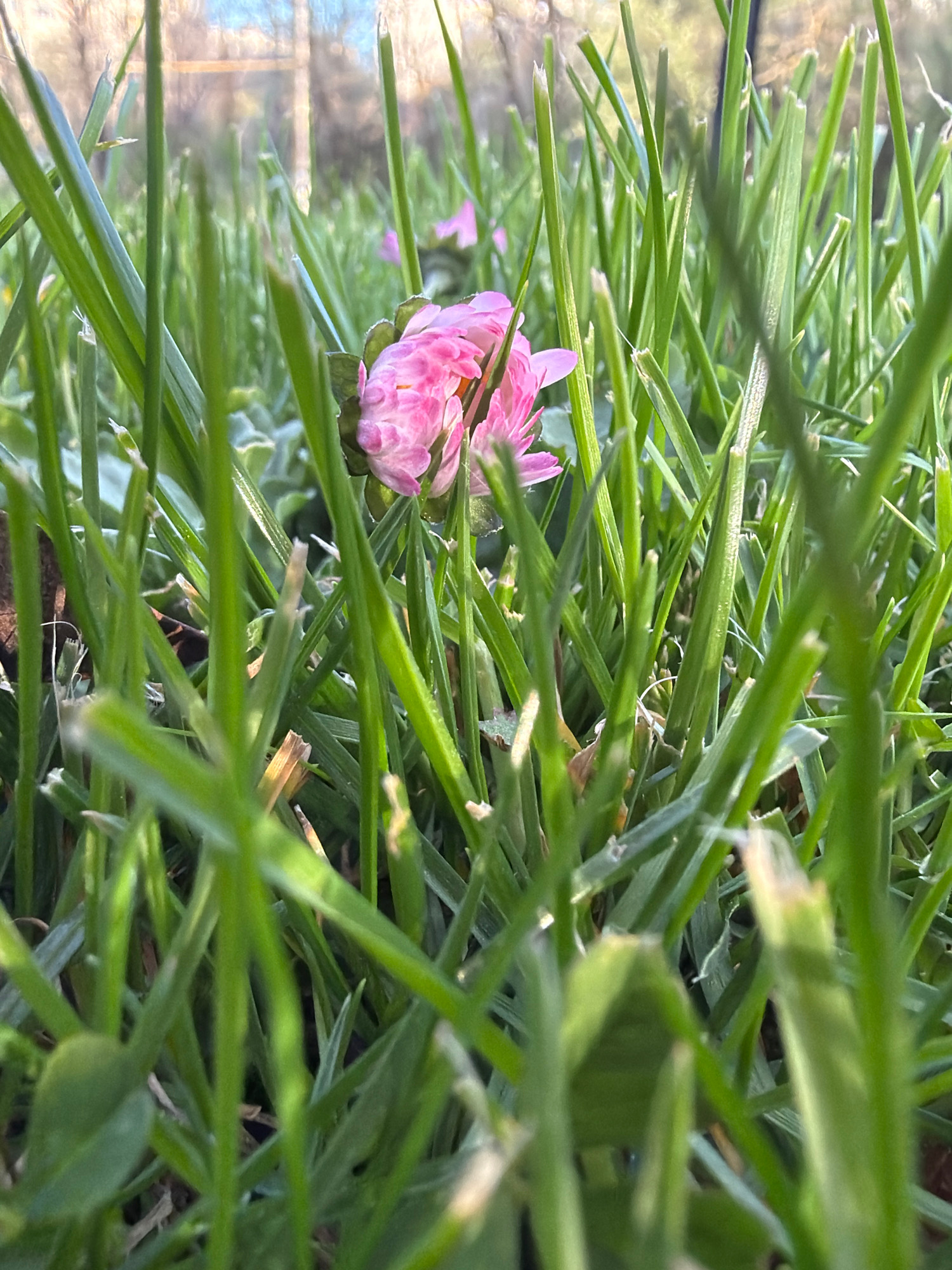 The image shows a close-up view of grass with a pink flower nestled within. The grass blades are primarily green with some frayed or brown tips. The flower is a light pink color and appears to be in b…read more