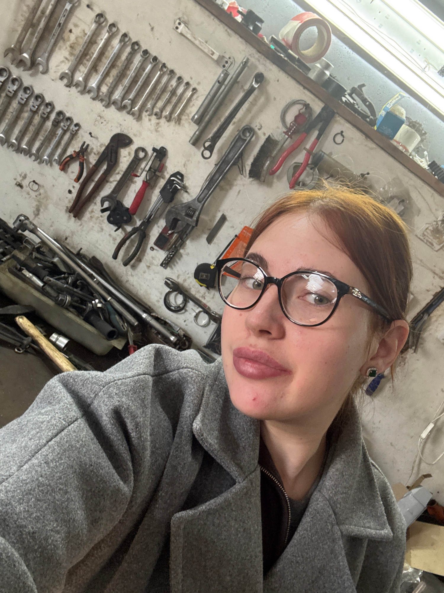 In an indoor setting within the city of Elovo, Russia, a young adult female is depicted in a self-portrait. She has fair skin, reddish-brown hair pulled back, and wears black-framed eyeglasses over li…read more