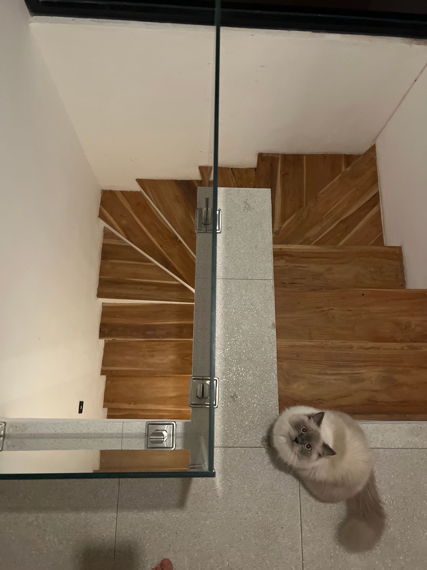 The image shows a staircase with wooden steps and a glass railing. A light-colored cat with grey markings and blue eyes sits on the tiled floor adjacent to the staircase, looking upwards. The stairs r…read more