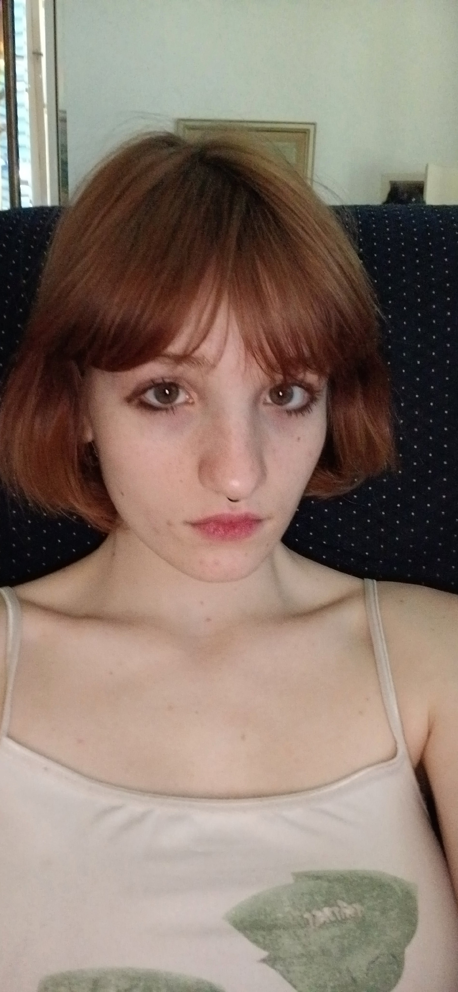 A young woman with red hair is lying down. She has fair skin and brown eyes, with a small nose ring in her left nostril. She wears a light-colored tank top with a graphic pattern on the right side. Th…read more