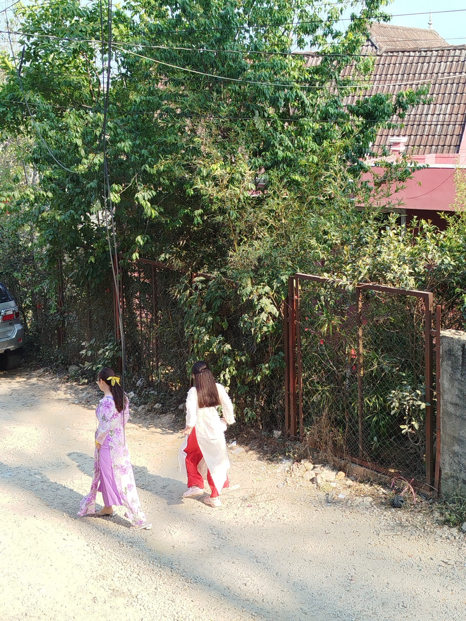 Two girls in traditional Vietnamese Ao Dai dresses are walking along a gravel road in a neighborhood, likely in Da Lat, Vietnam. The girl on the left wears a light purple floral Ao Dai with long flowi…read more