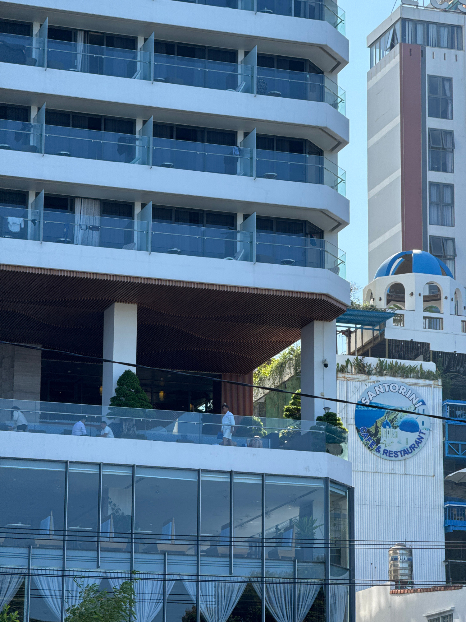 The image captures an urban scene in Nha Trang, Vietnam, focusing on two prominent buildings under a clear blue sky. The primary structure on the left is a multi-story white building, likely a hotel o…read more
