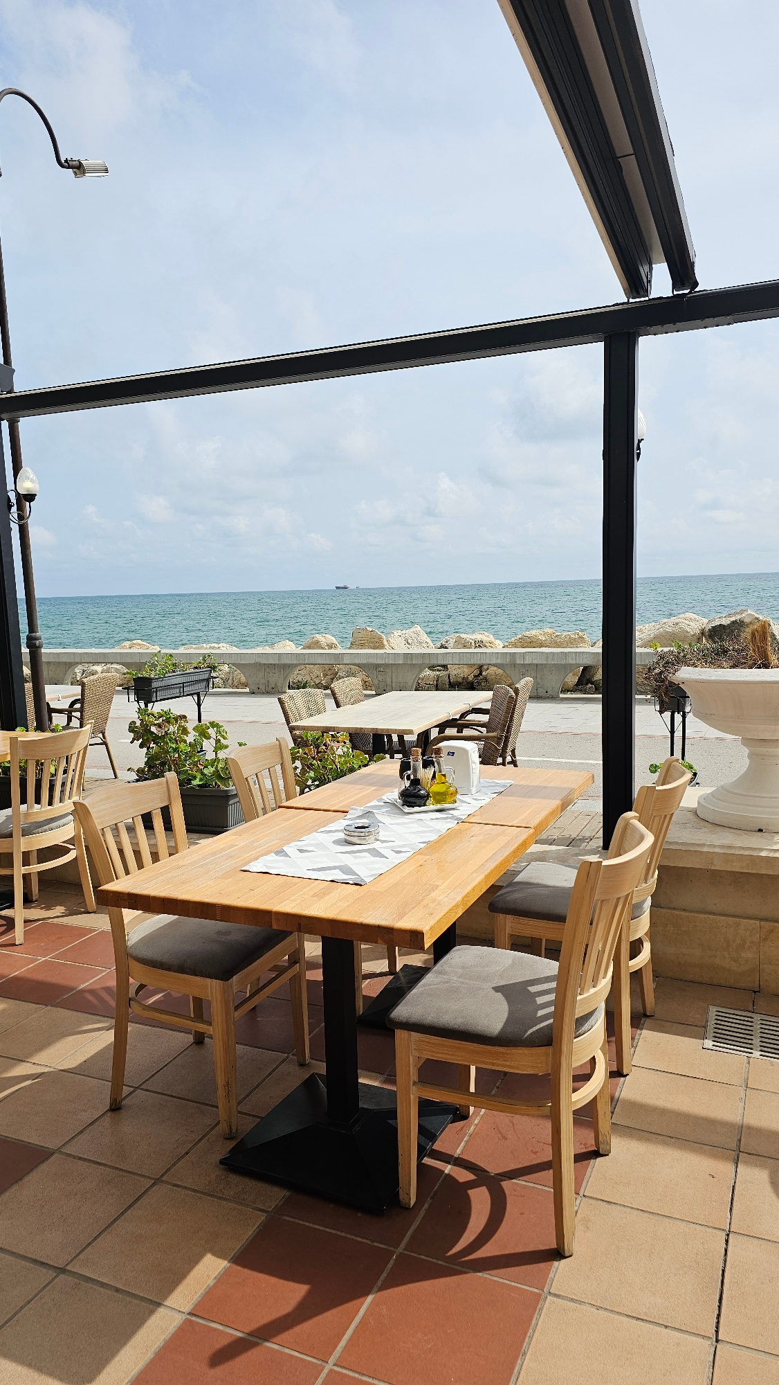 The image depicts a restaurant setting in Balchik, Bulgaria, positioned along the coastline. A long wooden table, set for a meal, is the central focus, draped with a white runner. Clear glassware, tab…read more